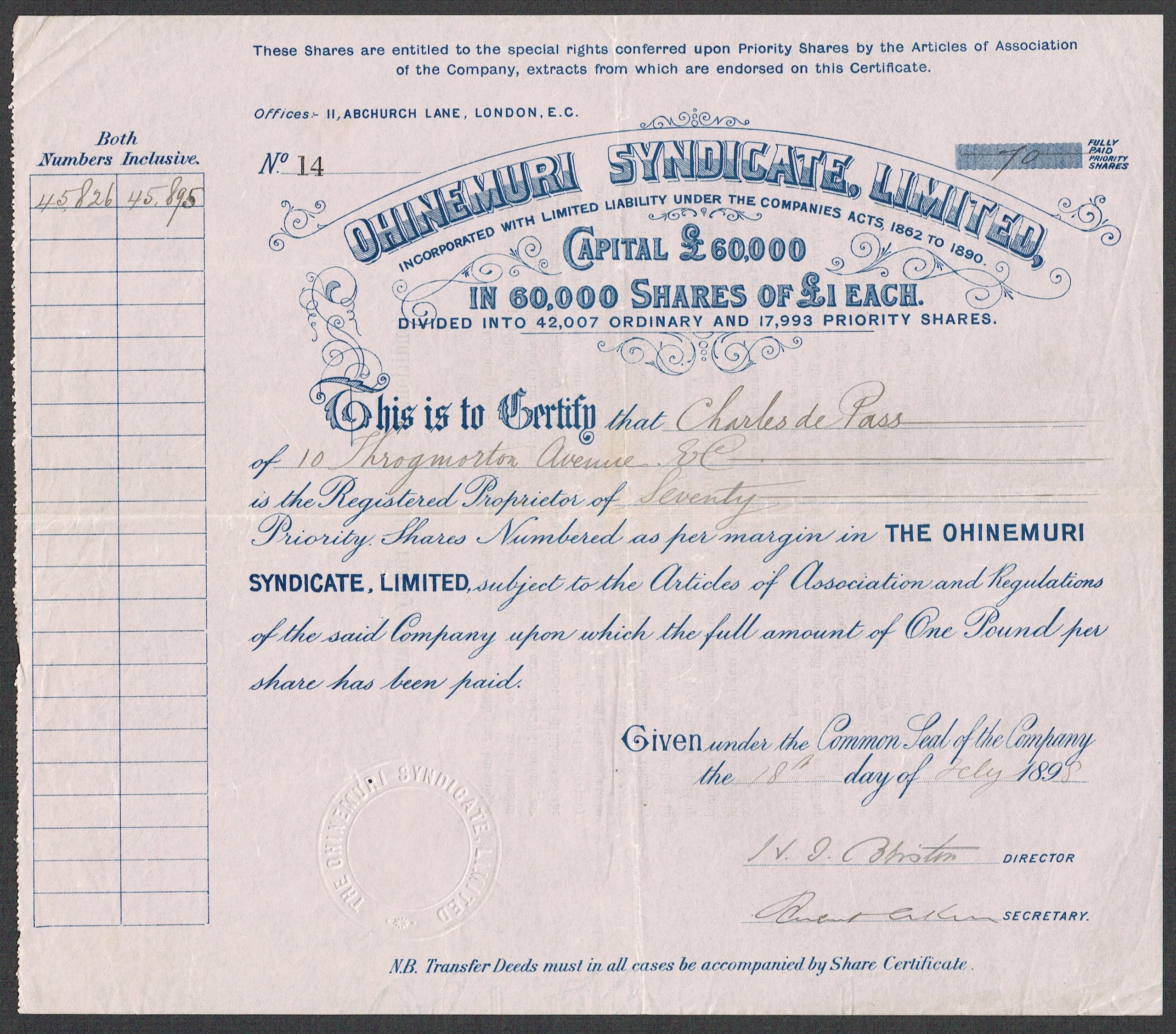Capital £60,000 in 42,007 ordinary and 17,993 priority shares of £1 each.