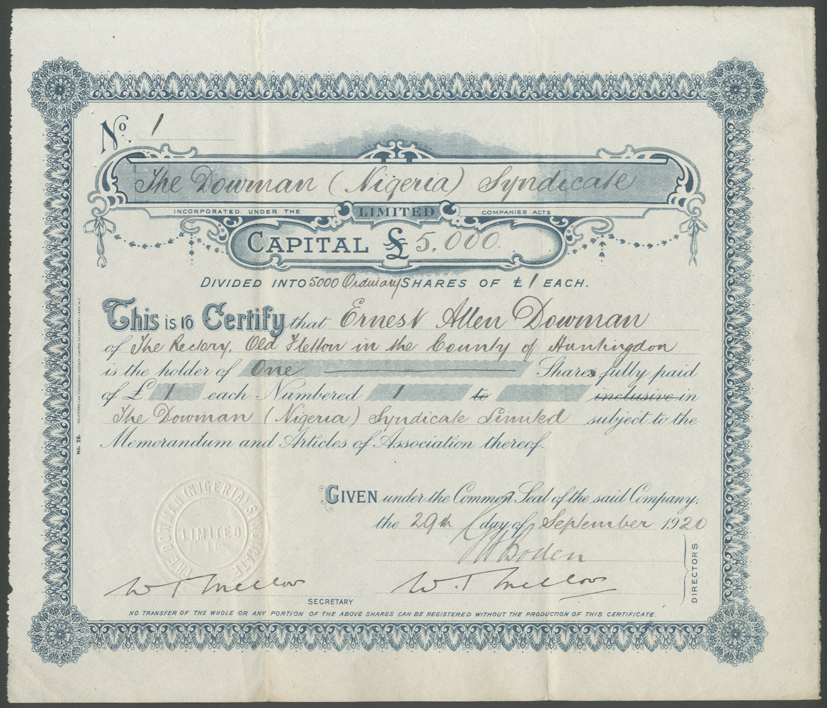 Registered 1st September 1920 to acquire from E. A. Dowman, alluvial mining rights at Jos, Northern Nigeria.