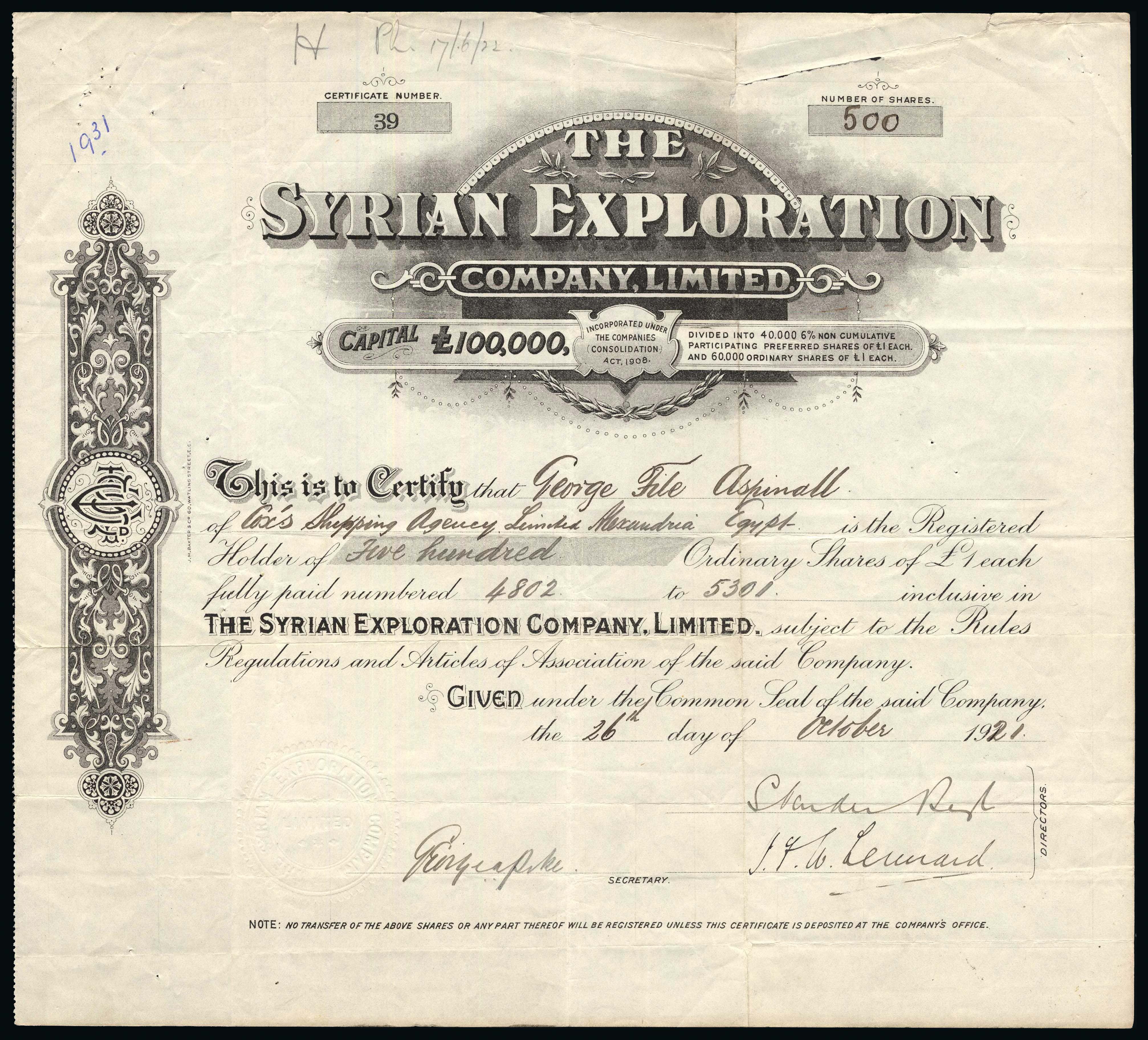 Registered 1912 to extract petroleum from the Yarmuk Valley between southwestern Syria and northwestern Jordan. Dissolved <1932. Company number 125913