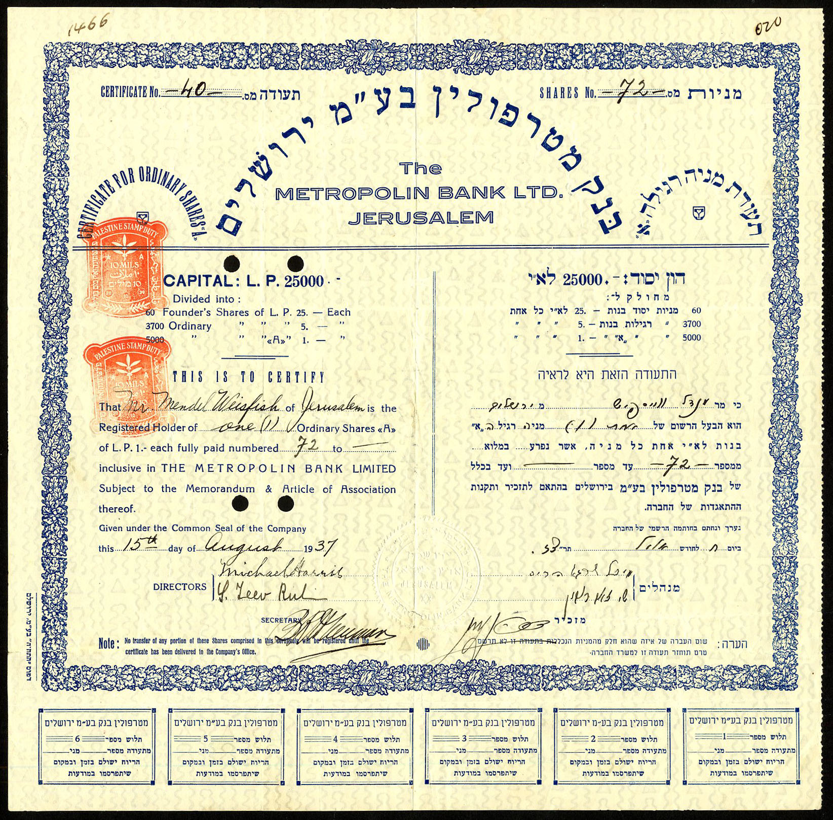 Incorporated in Palestine on the 9th July 1928.