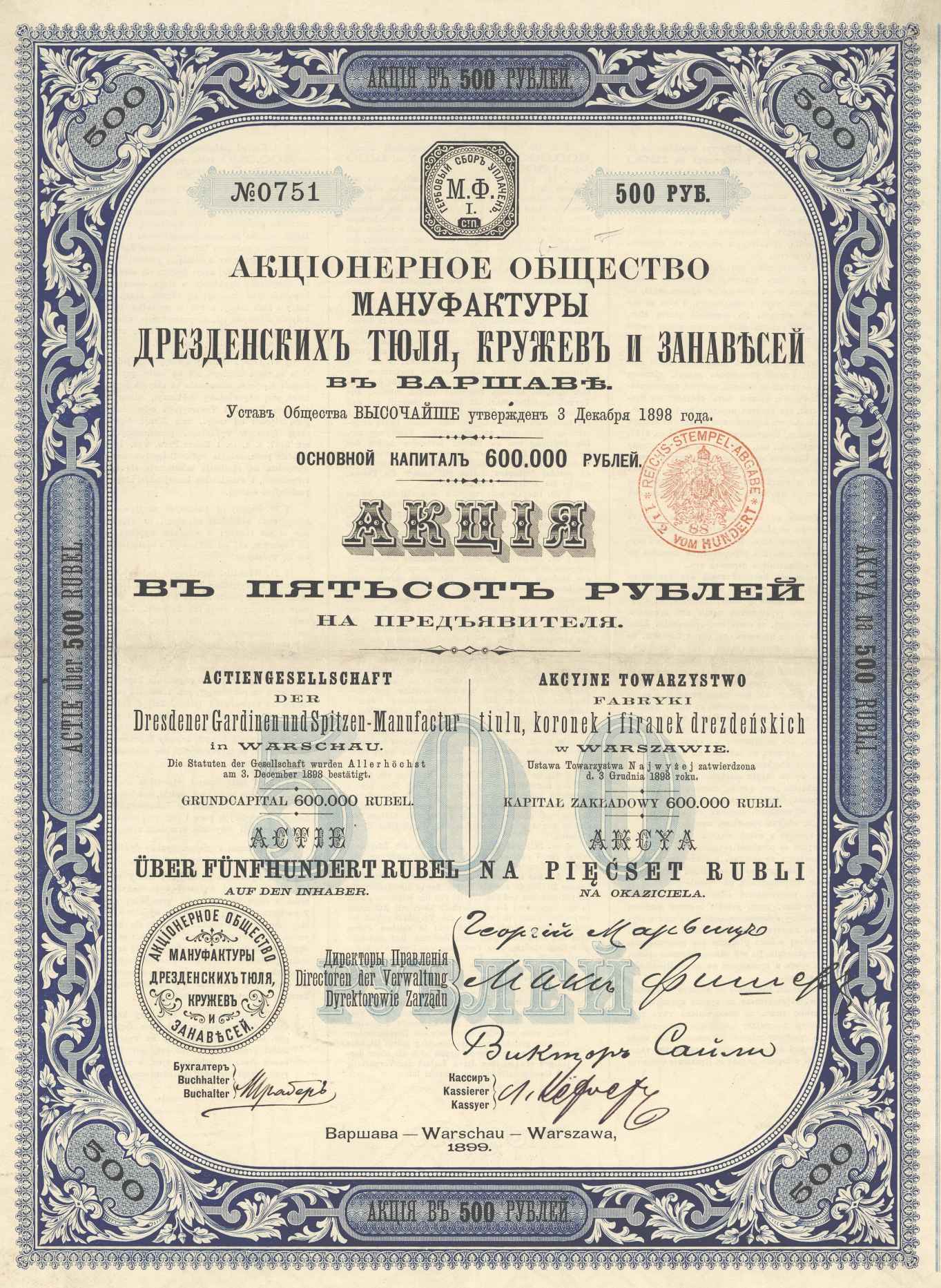 Formed in 1898 with head office in Warsaw. Capital was 600,000 roubles in shares of 500 roubles.