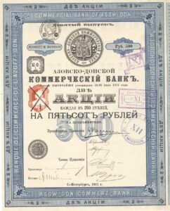 Formed in 1871 with head office in Taganrog / St. Petersburg. Initial capital was 3,000,000 roubles in shares of 250 roubles. In 1883, capital was reduced to 2,000,000 roubles by exchanging the original 12,000 shares for 8,000 new shares at the same nominal price of 250 roubles. After 1890, capital increased rapidly, reaching 60,000,000 roubles by 1916. Replacement certificates were issued every 10 years when coupon sheets were exhausted.