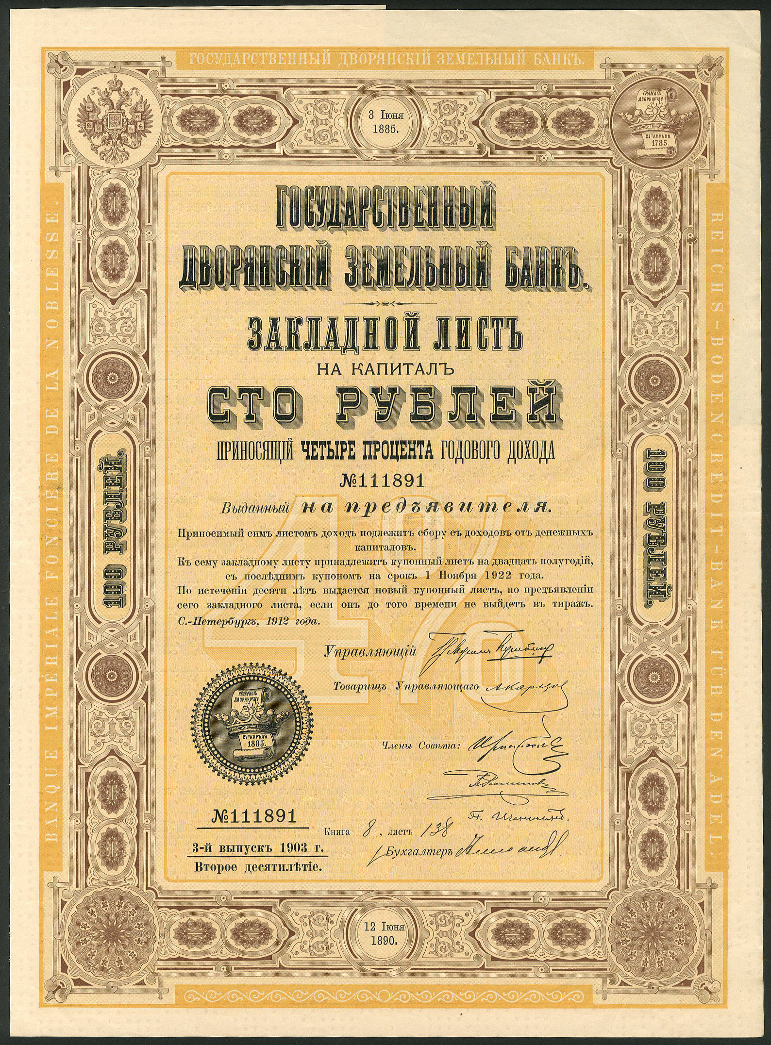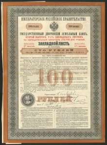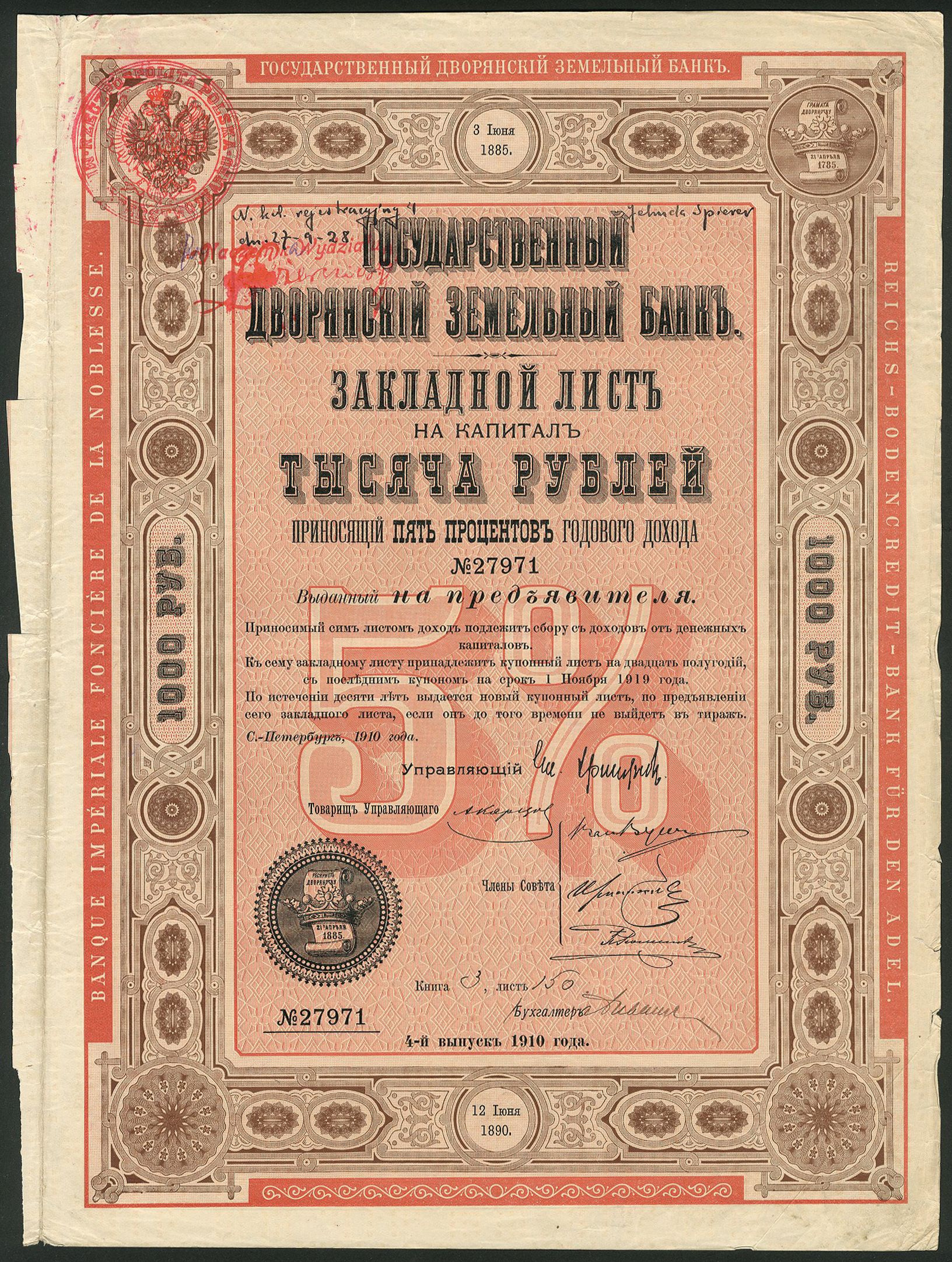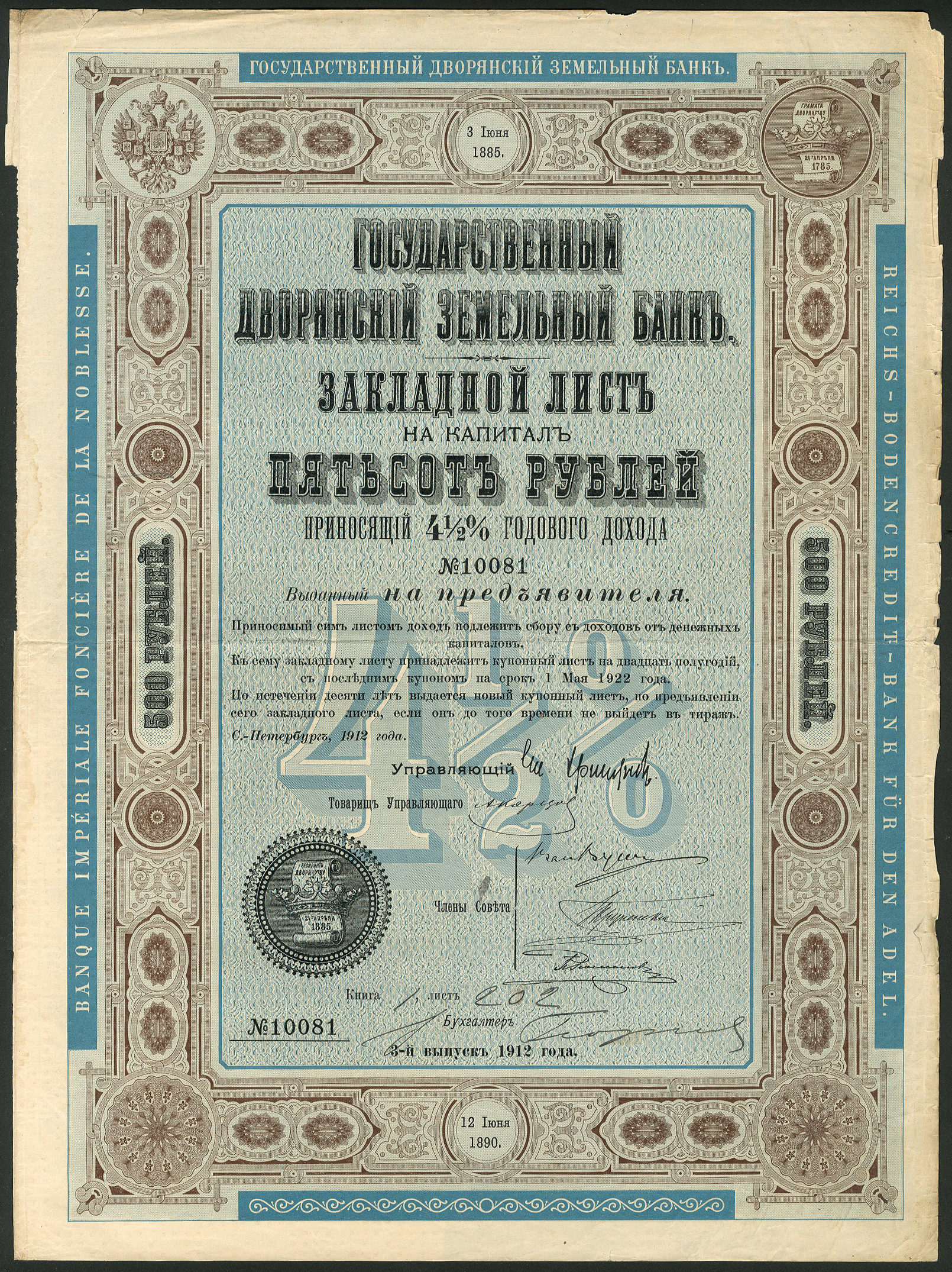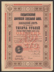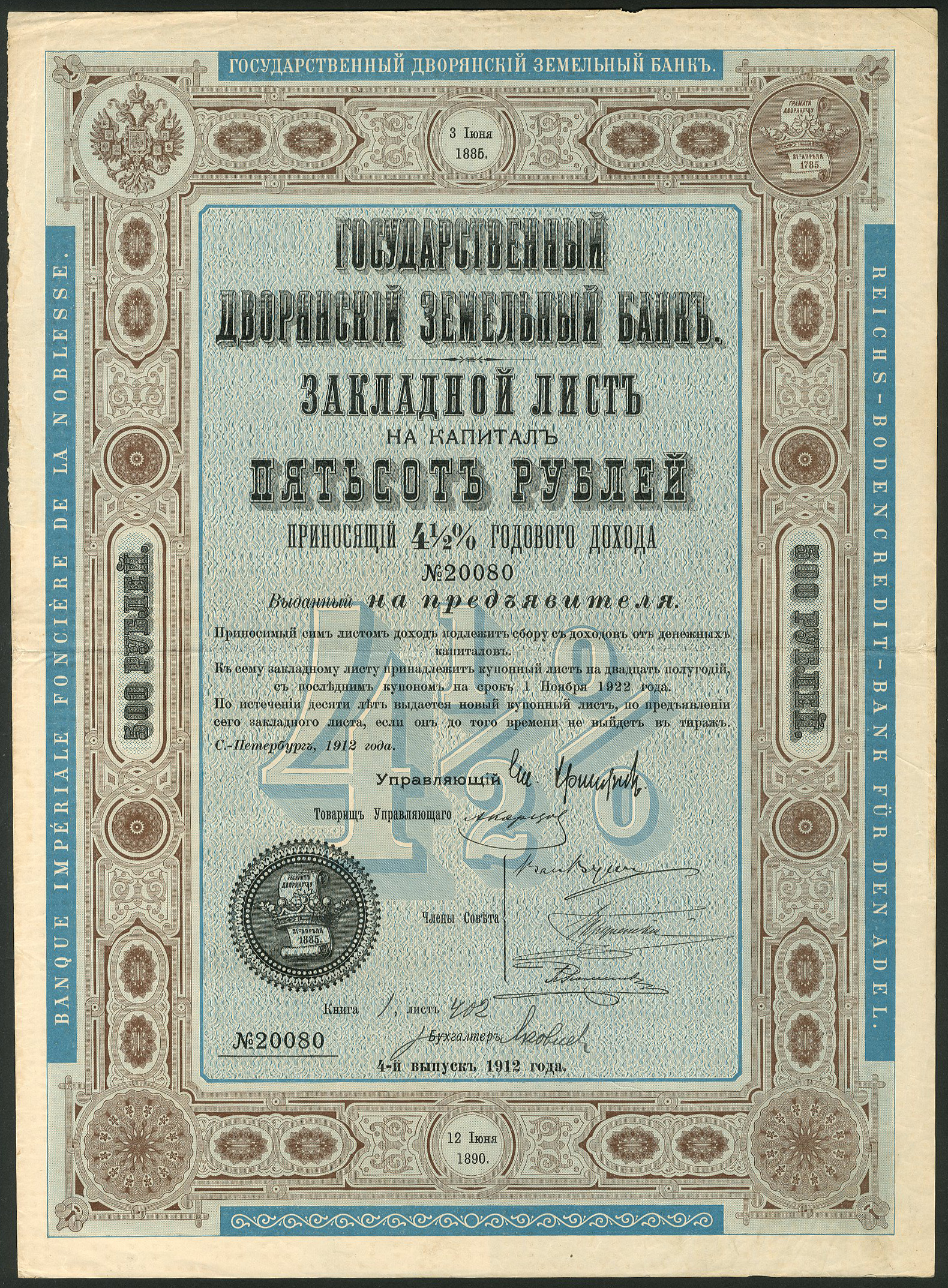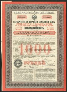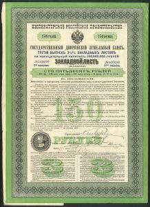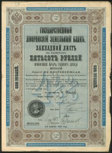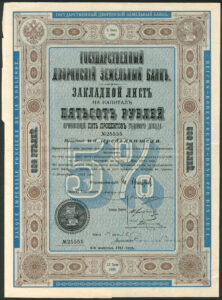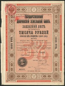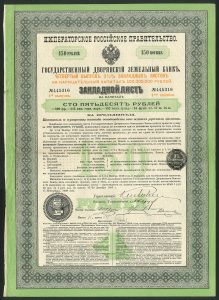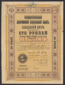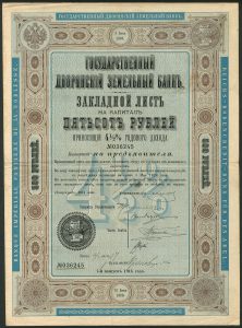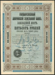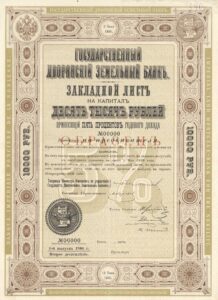The bank was formed in 1885 to offer low-cost loans to the Russian landed nobility on mortgages of their estates. In 1900, this bank granted credits of 660 million roubles while the corresponding bank for the peasants granted 70 million roubles. With the acceleration of the transfer of land from the nobility to the farmers (perhaps better phrased as ‘rural bourgeoisie’, not the average farmer), the issuance of new loans by the State Noble Land Bank slowed down. By 1914,the outstanding long-term loans amounted to 894 million roubles which was about the same amount of the money lent by the agrarian banks. After the 1917 Revolution, the State Noble Land Bank was liquidated.