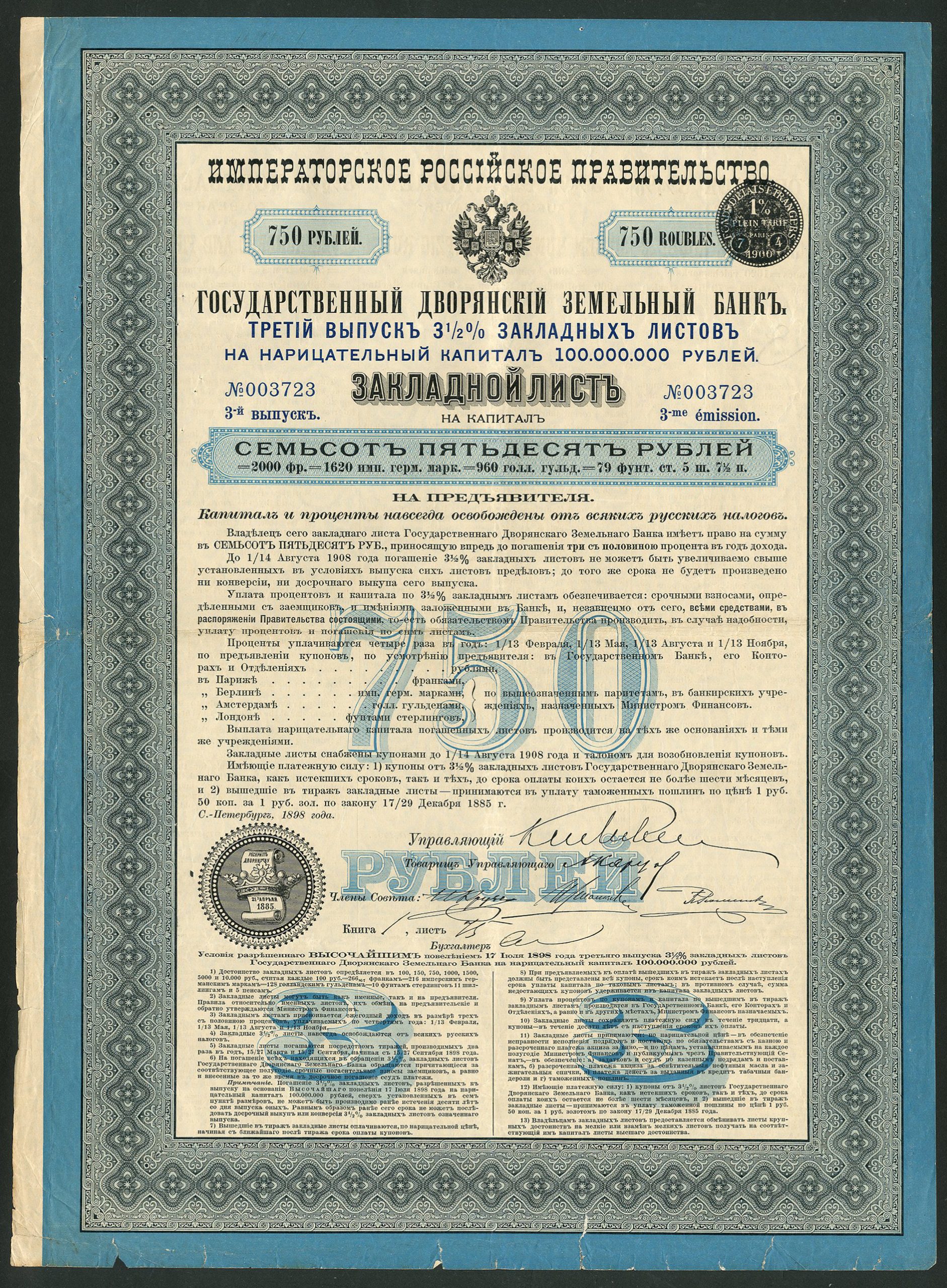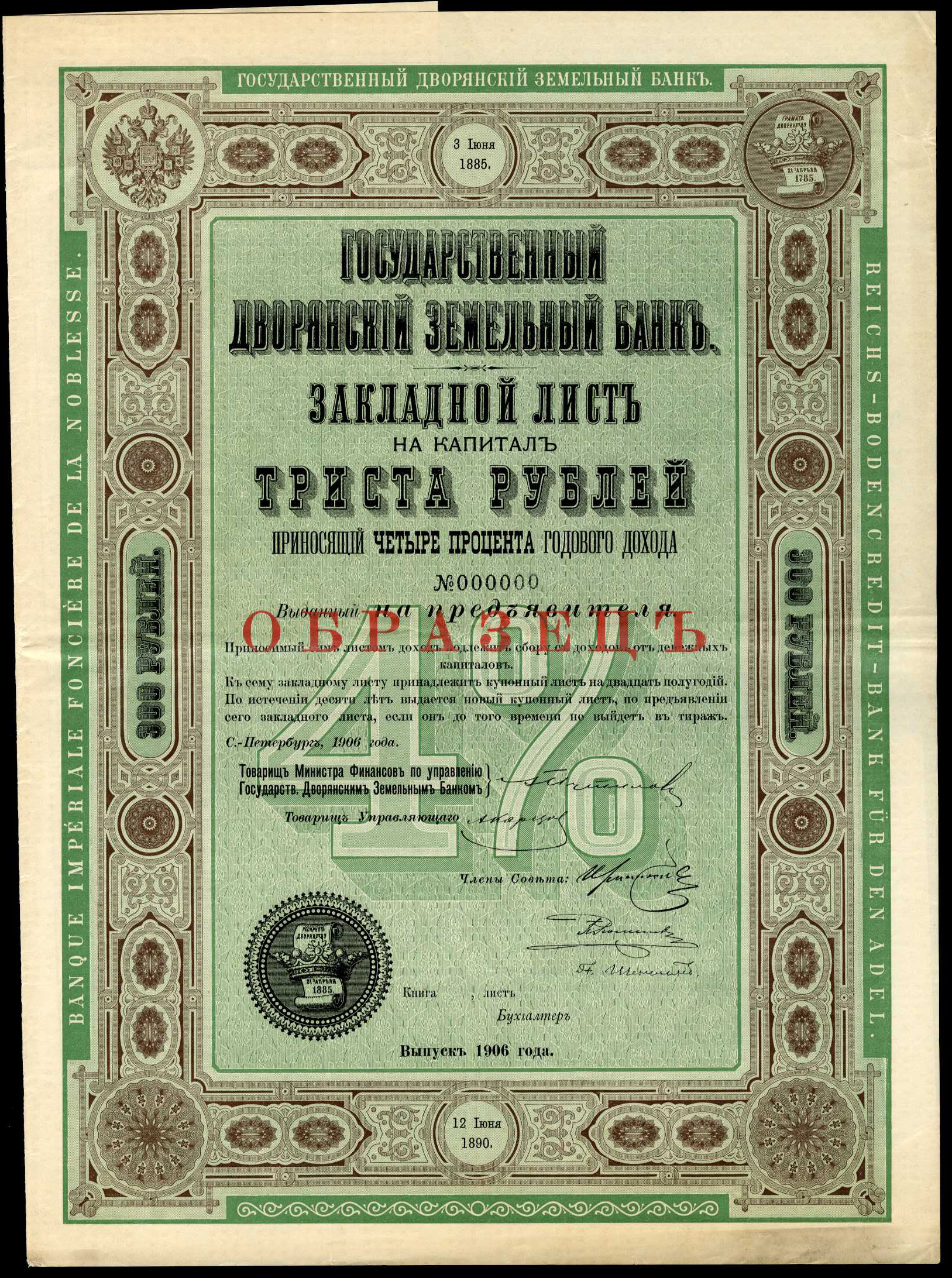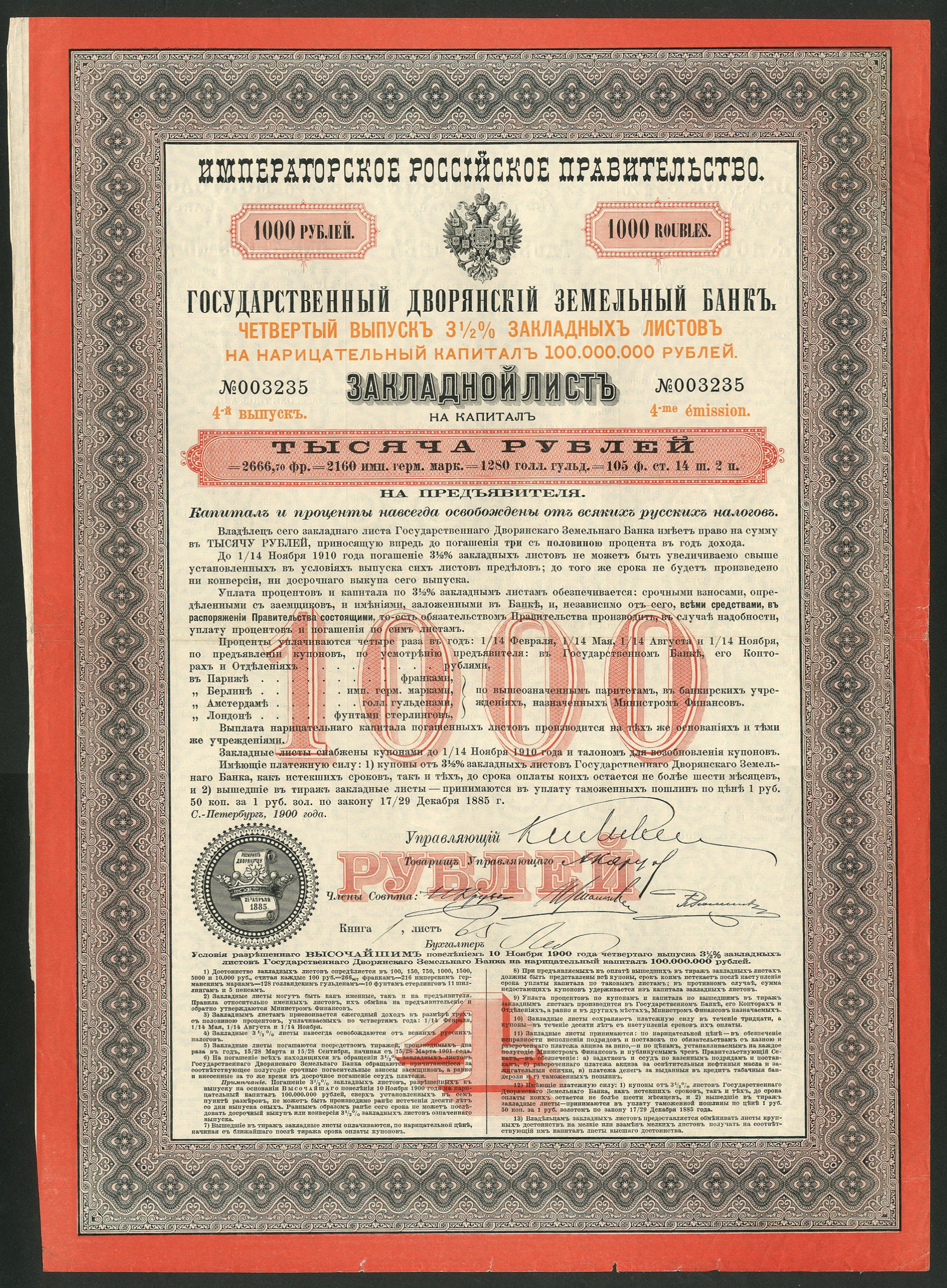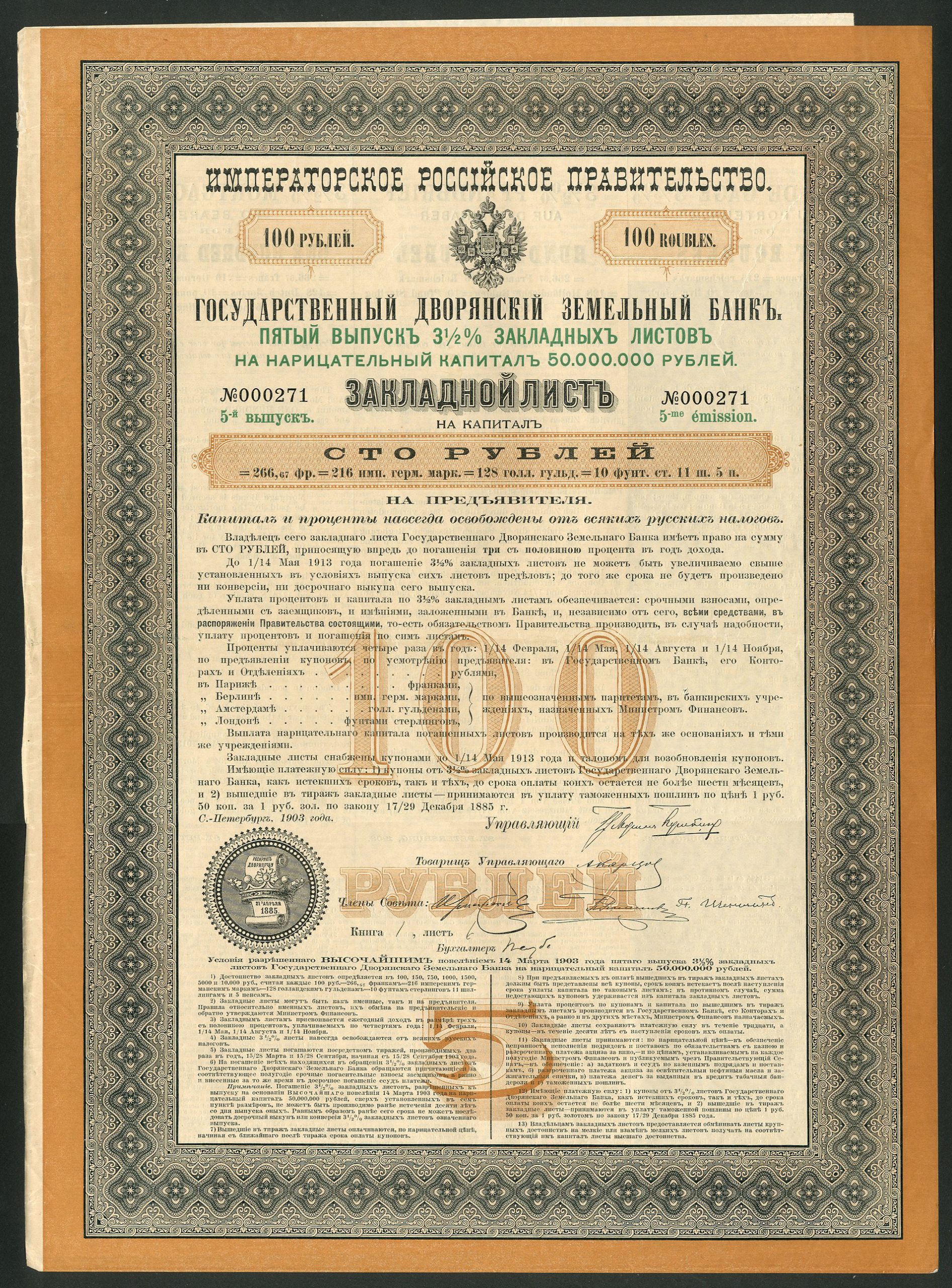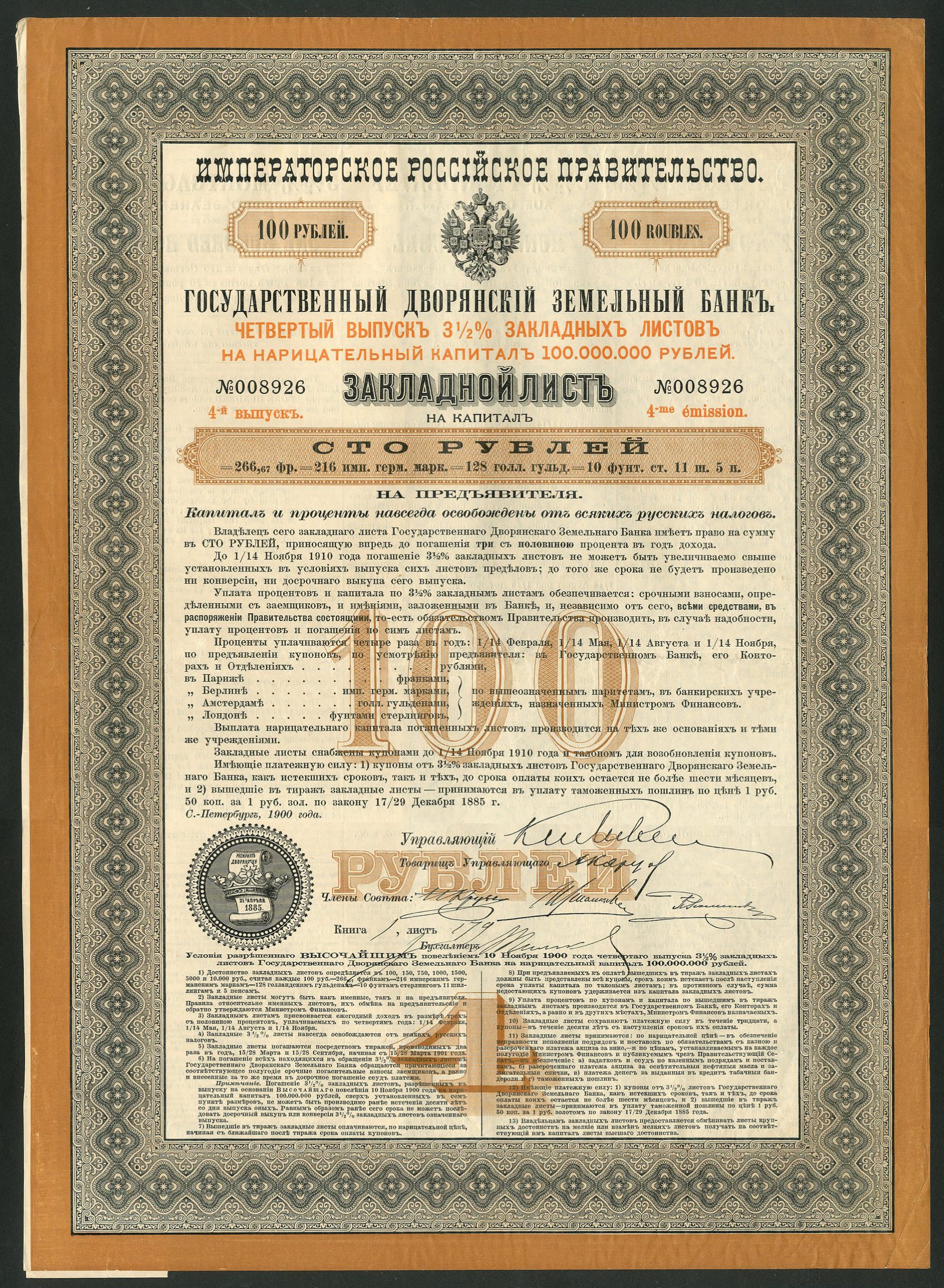 The bank was formed in 1885 to offer low-cost loans to the Russian landed nobility on mortgages of their estates. In 1900, this bank granted credits of 660 million roubles while the corresponding bank for the peasants granted 70 million roubles. With the acceleration of the transfer of land from the nobility to the farmers (perhaps better phrased as ‘rural bourgeoisie’, not the average farmer), the issuance of new loans by the State Noble Land Bank slowed down. By 1914,the outstanding long-term loans amounted to 894 million roubles which was about the same amount of the money lent by the agrarian banks. After the 1917 Revolution, the State Noble Land Bank was liquidated.