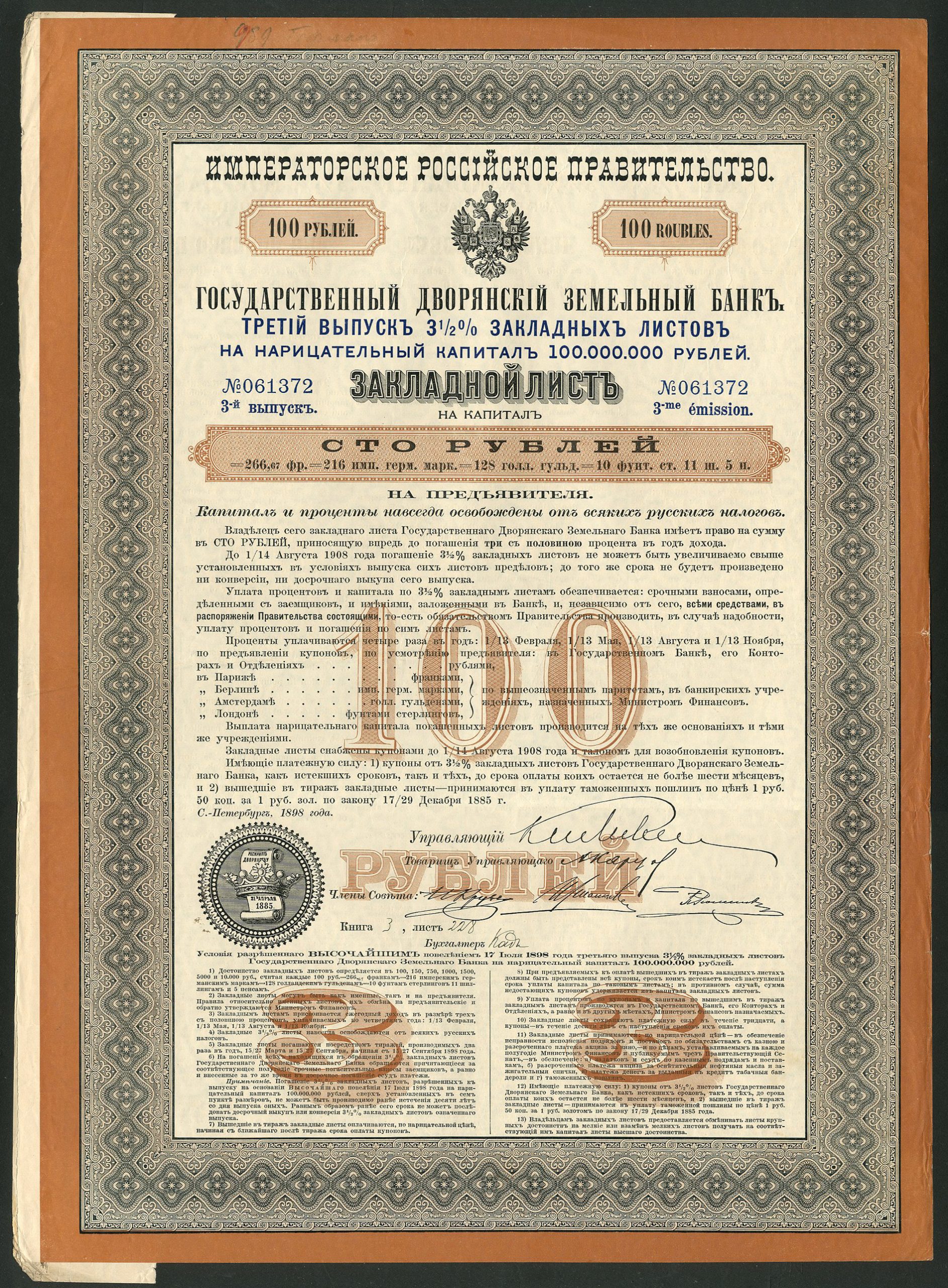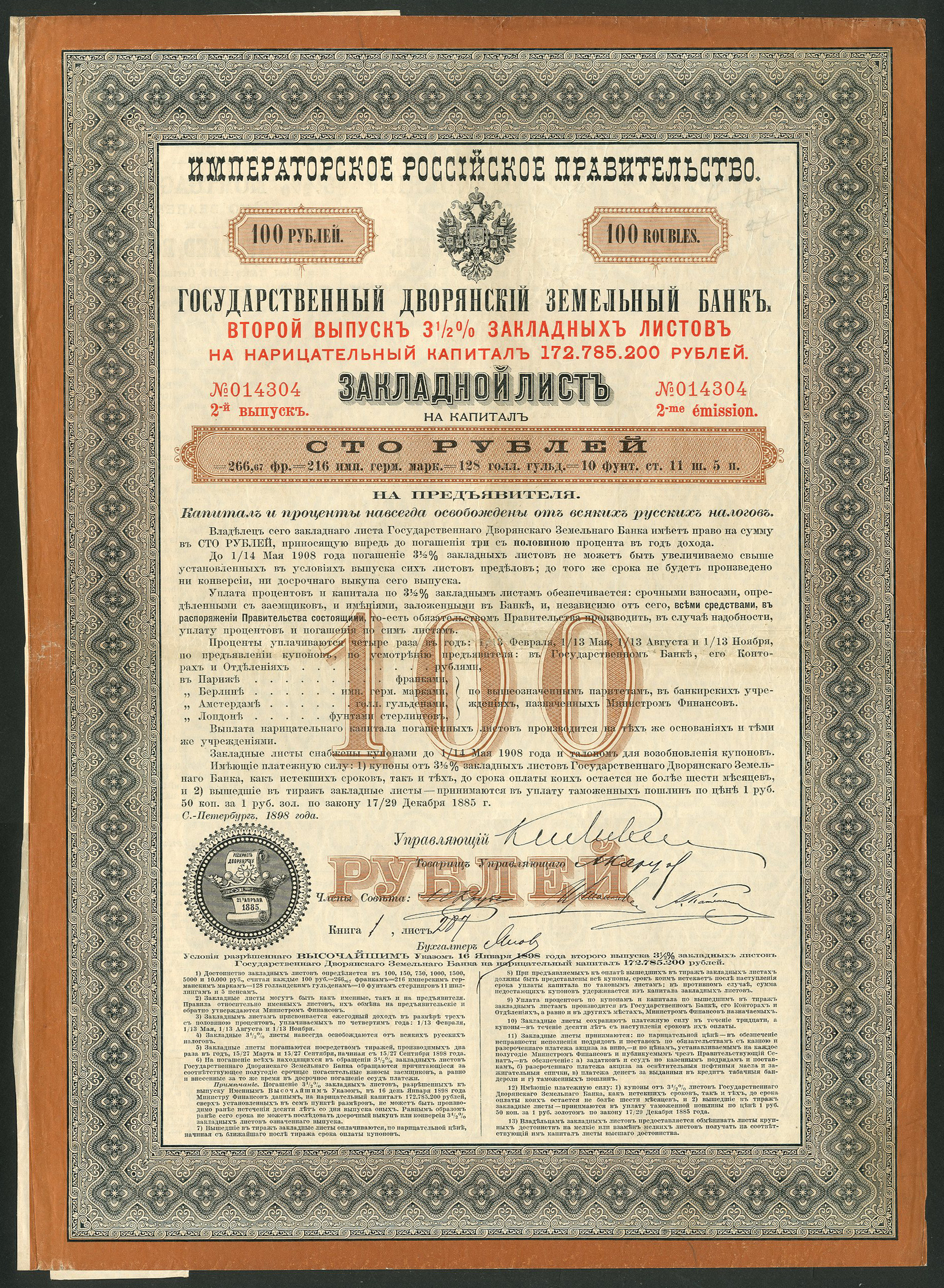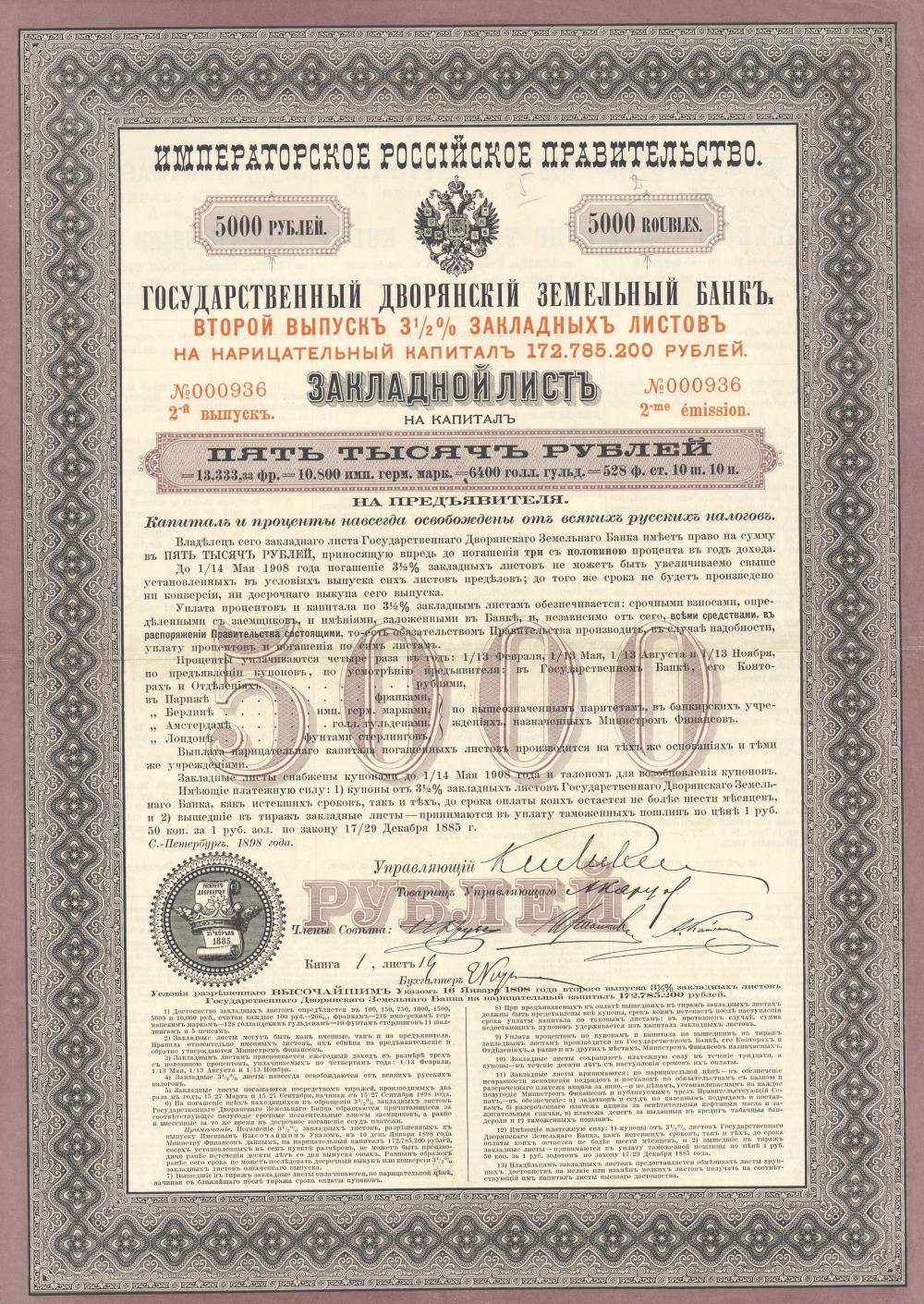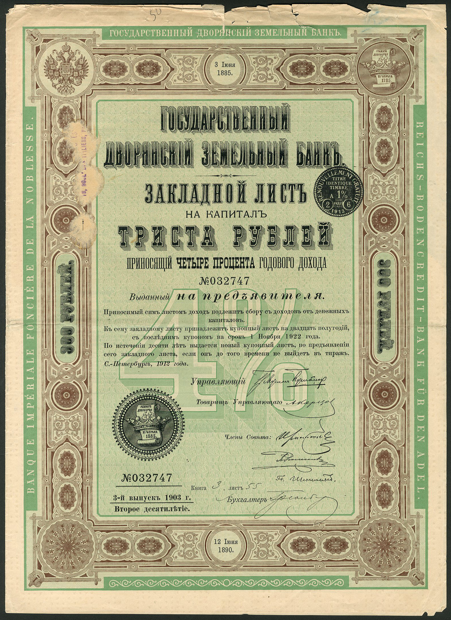The bank was formed in 1885 to offer low-cost loans to the Russian landed nobility on mortgages of their estates. In 1900, this bank granted credits of 660 million roubles while the corresponding bank for the peasants granted 70 million roubles. With the acceleration of the transfer of land from the nobility to the farmers (perhaps better phrased as ‘rural bourgeoisie’, not the average farmer), the issuance of new loans by the State Noble Land Bank slowed down. By 1914,the outstanding long-term loans amounted to 894 million roubles which was about the same amount of the money lent by the agrarian banks. After the 1917 Revolution, the State Noble Land Bank was liquidated.