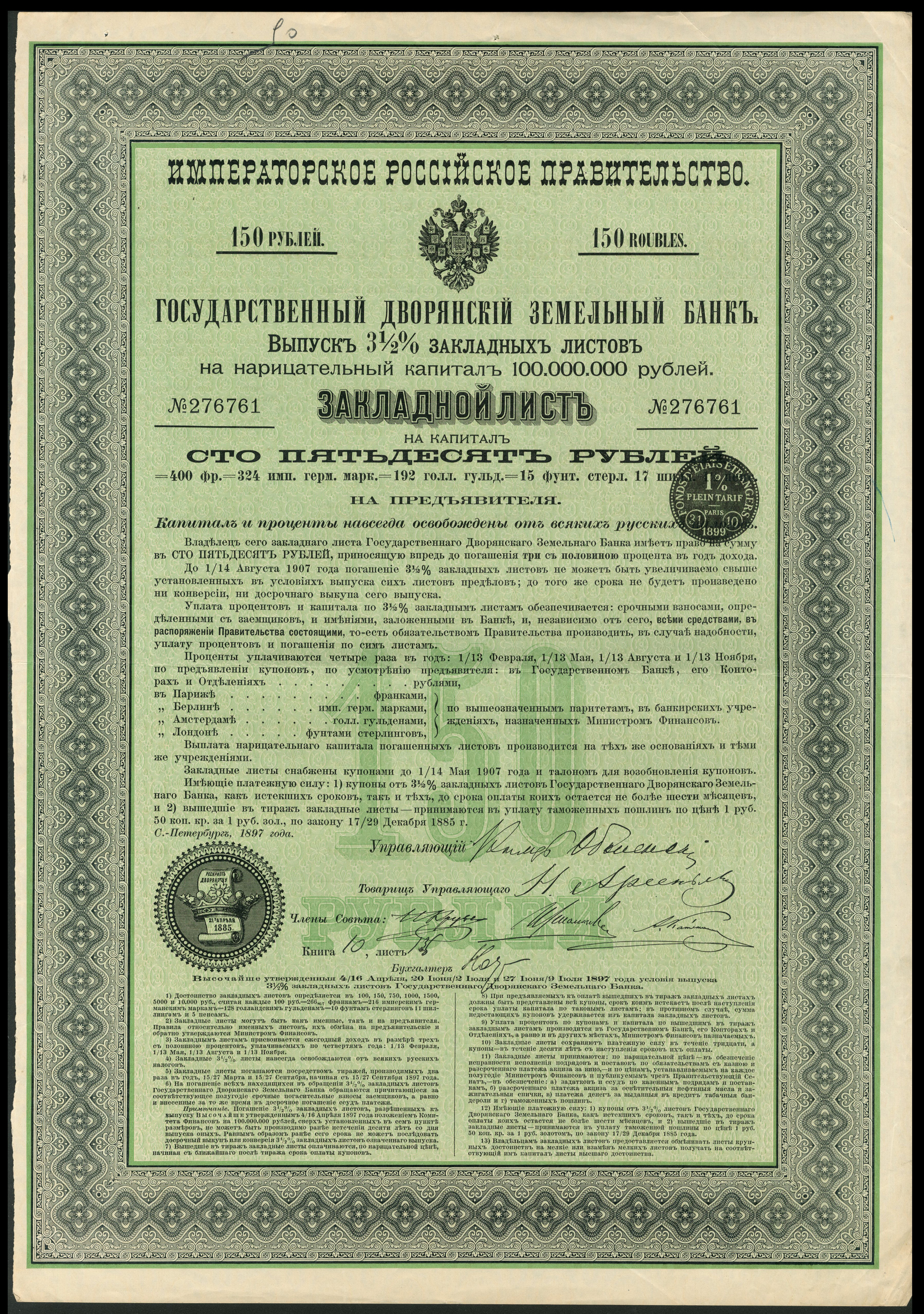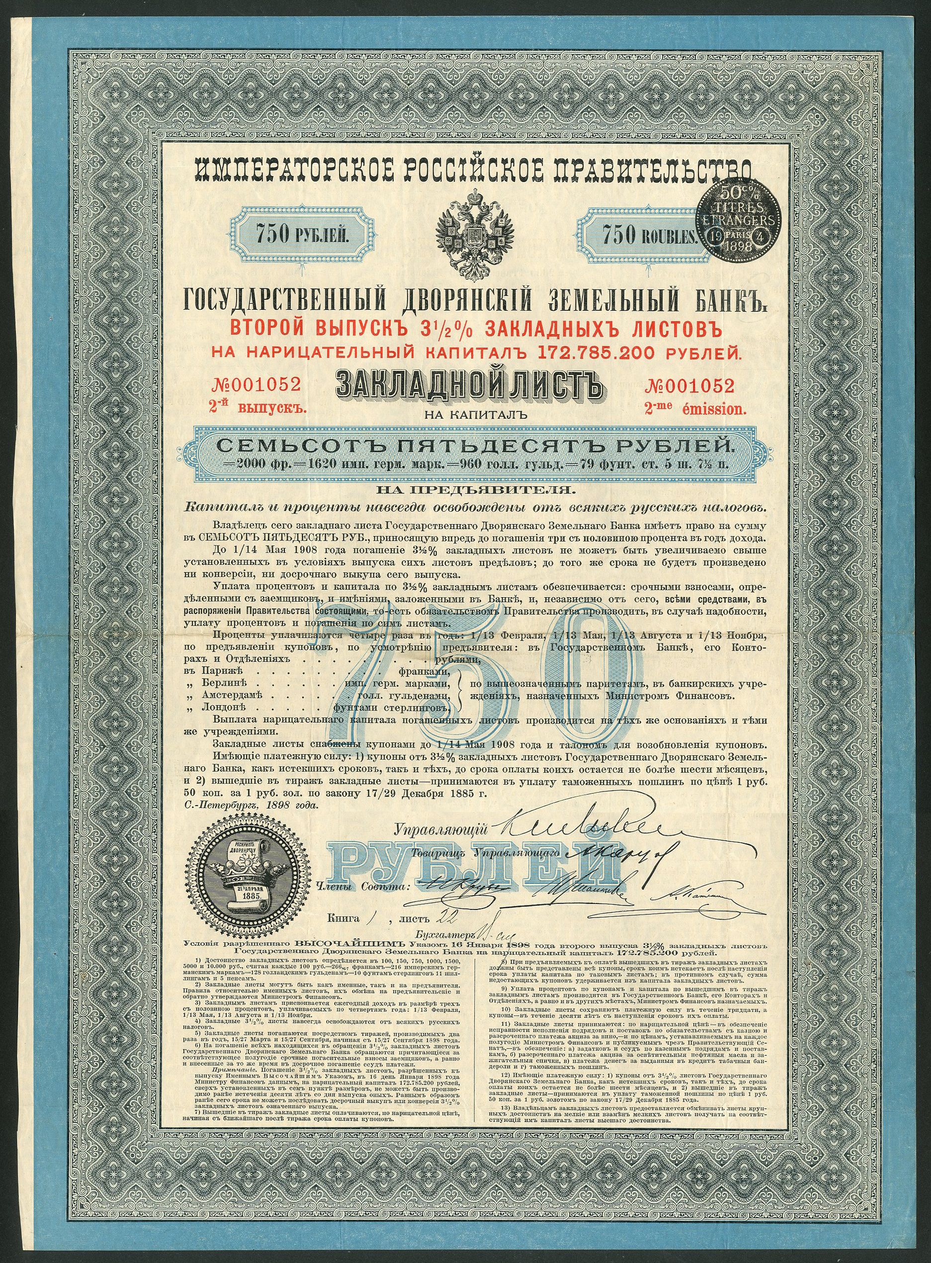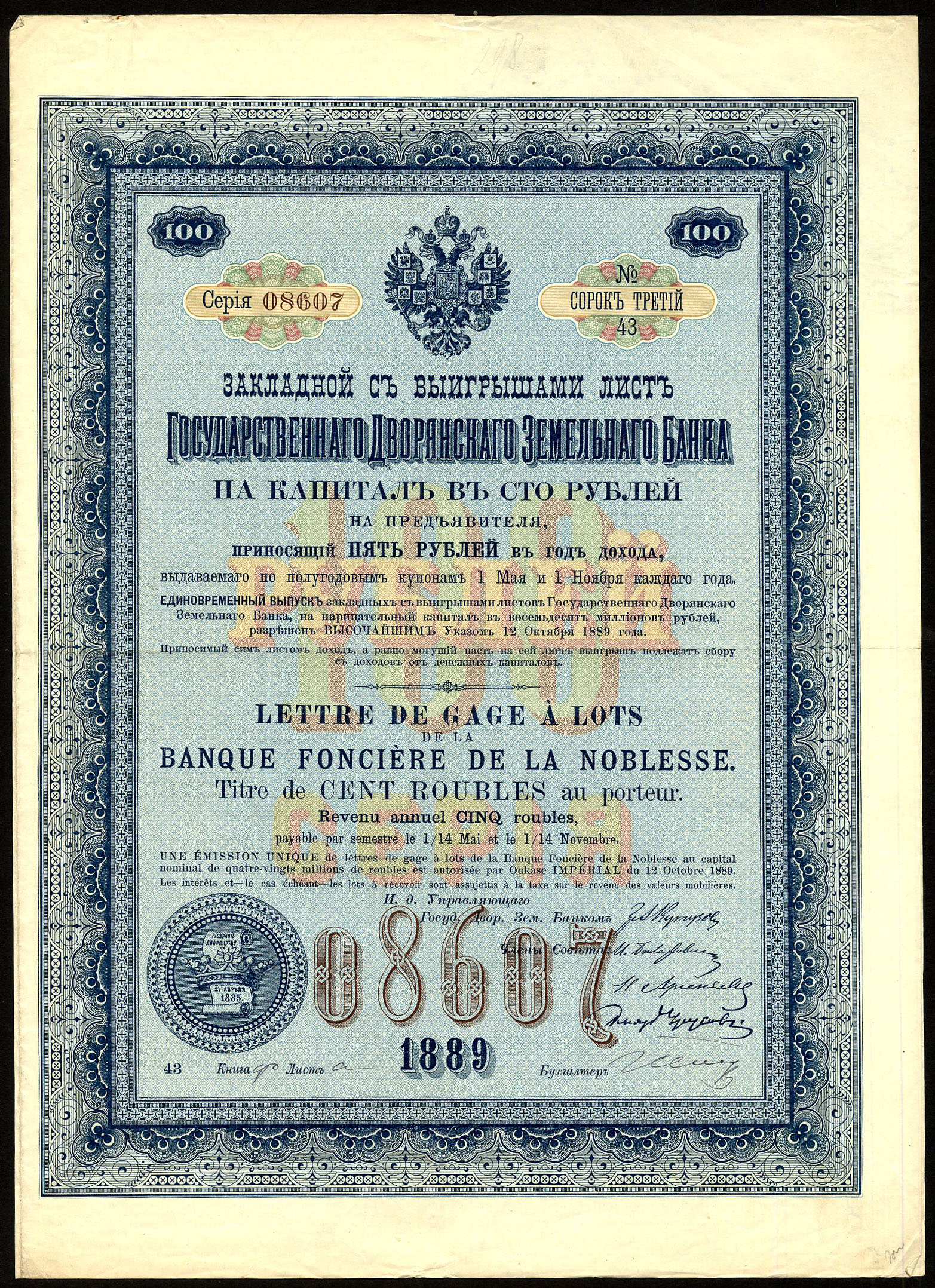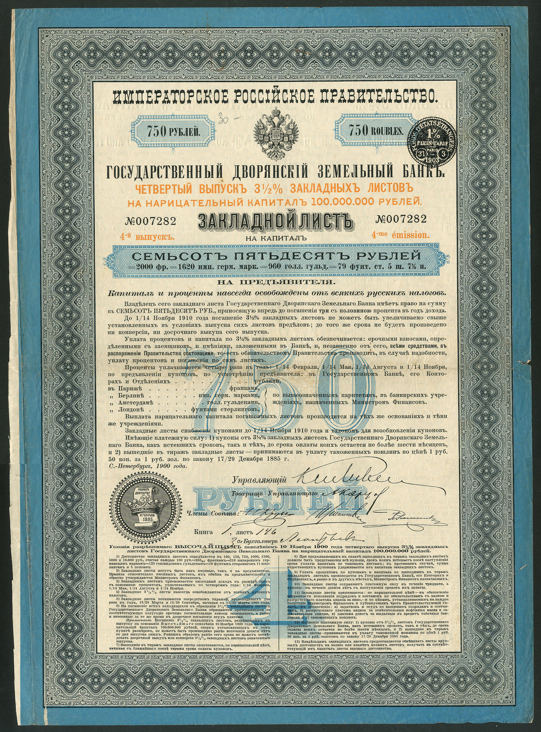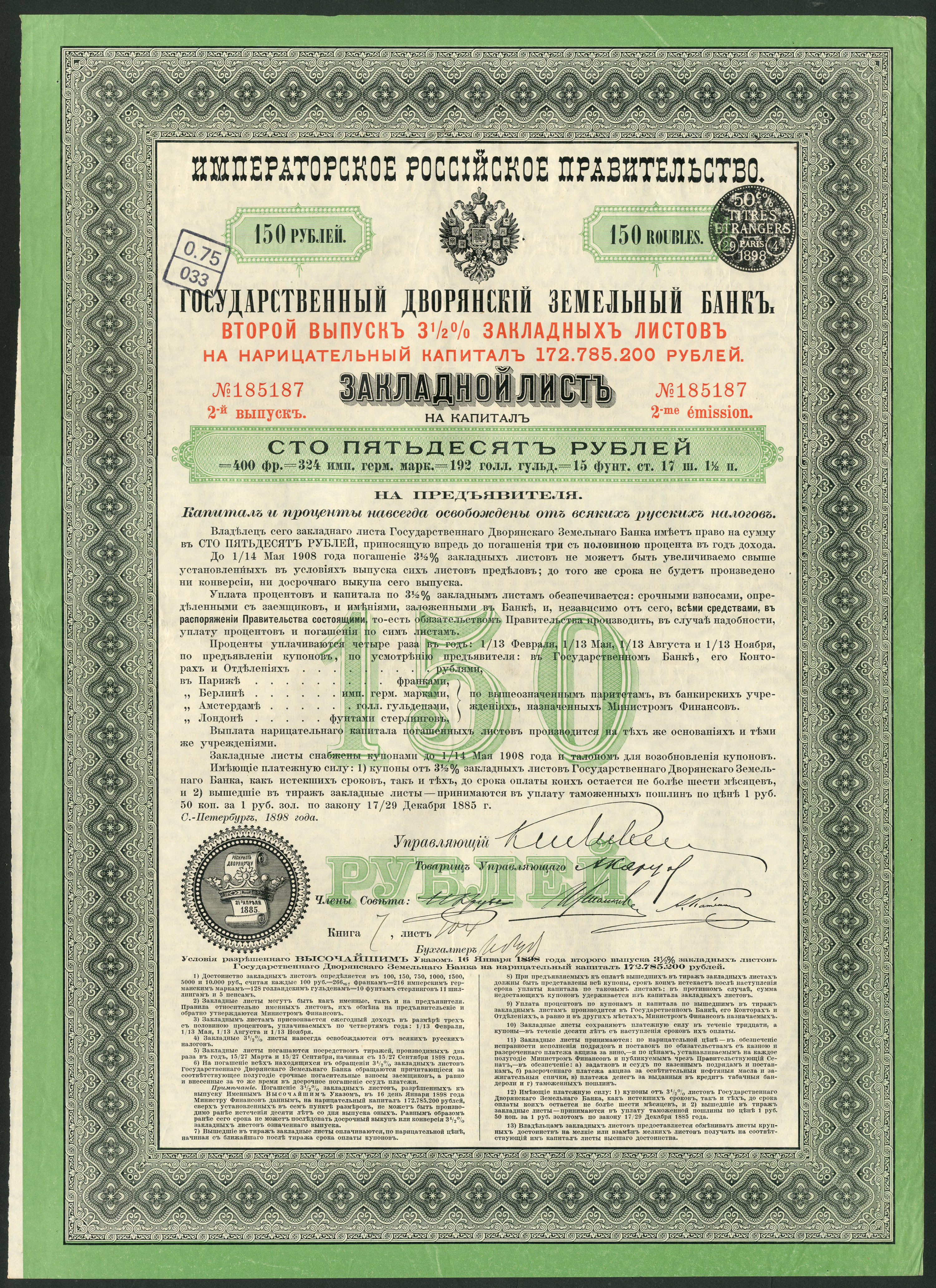 The bank was formed in 1885 to offer low-cost loans to the Russian landed nobility on mortgages of their estates. In 1900, this bank granted credits of 660 million roubles while the corresponding bank for the peasants granted 70 million roubles. With the acceleration of the transfer of land from the nobility to the farmers (perhaps better phrased as ‘rural bourgeoisie’, not the average farmer), the issuance of new loans by the State Noble Land Bank slowed down. By 1914,the outstanding long-term loans amounted to 894 million roubles which was about the same amount of the money lent by the agrarian banks. After the 1917 Revolution, the State Noble Land Bank was liquidated.