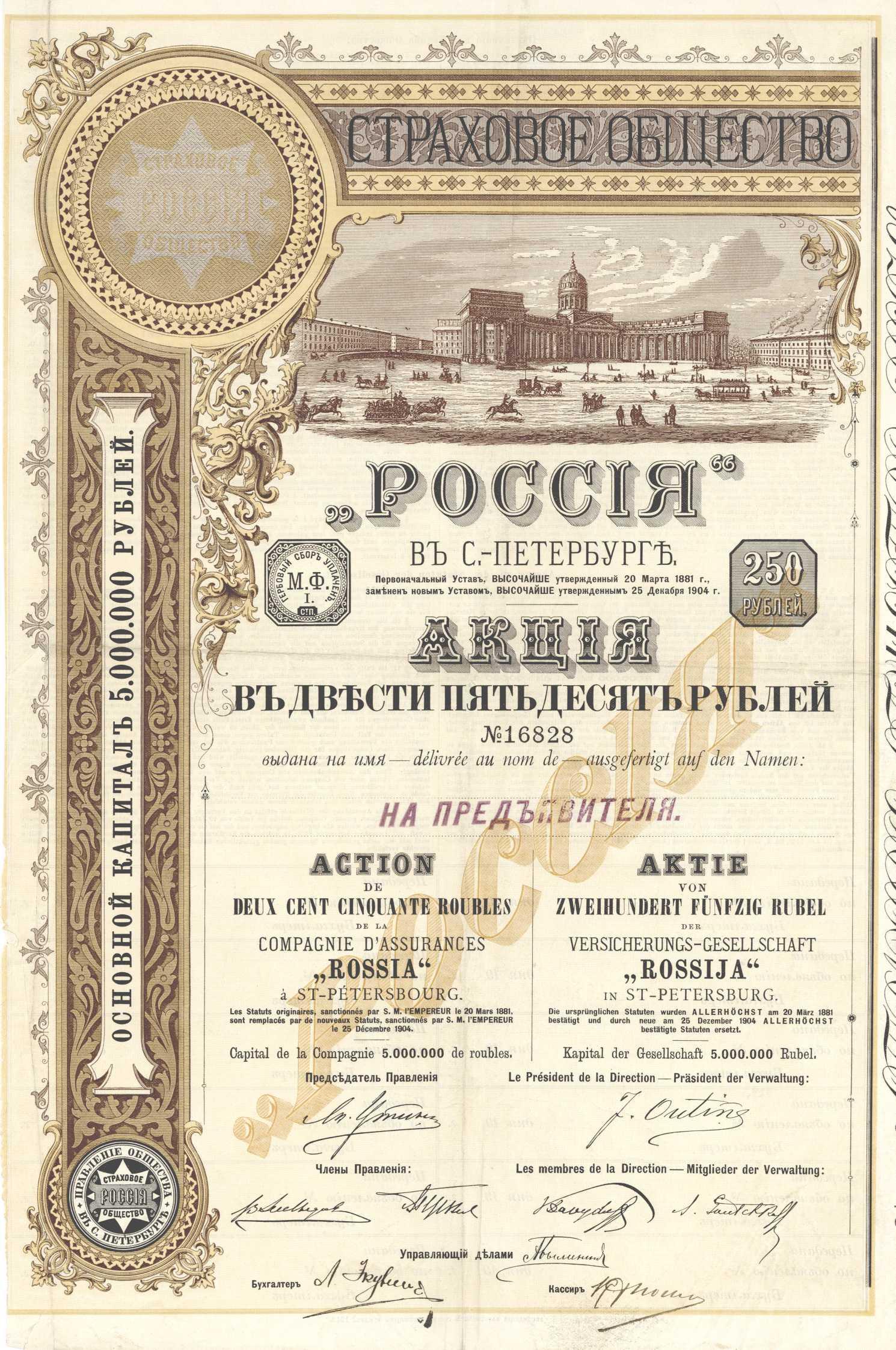 Formed in 1881 with head office in St. Petersburg. Initial capital was 4,000,000 roubles in shares of 250 roubles. Capital was increased in 1914 to 5,000,000 roubles. The company undertook fire, life and marine insurance business on an international level and was, by far, Russia’s biggest insurance company. It was taken over by state-owned Gosstrach after the Revolution.