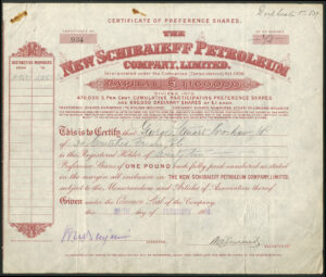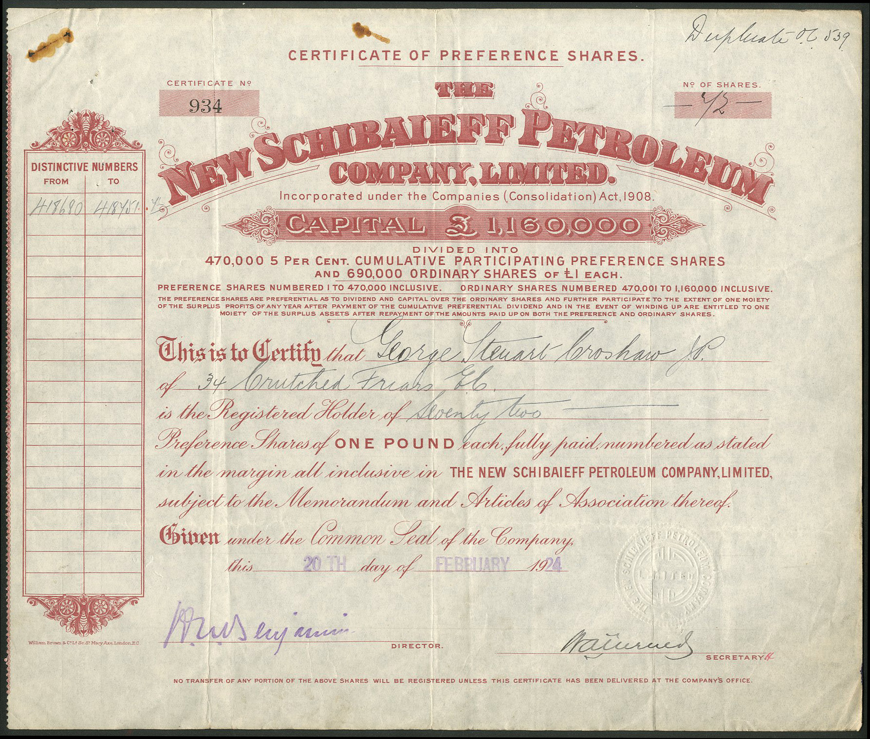 The company was registered in London before 1913. Capital was £1,160,000 in 690,000 ordinary shares of £1 and 470,000 5% participating preference shares of £1. The company owned 100% of the share capital of Company for the Manufacture of Russian Mineral Oils and other Chemical Products, trading as S. M. Schibaieff & Co., based in Moscow.