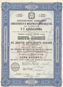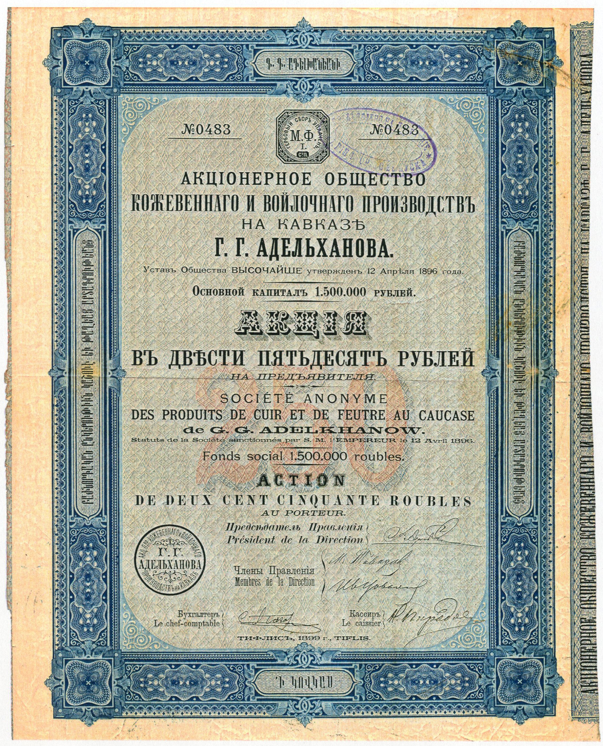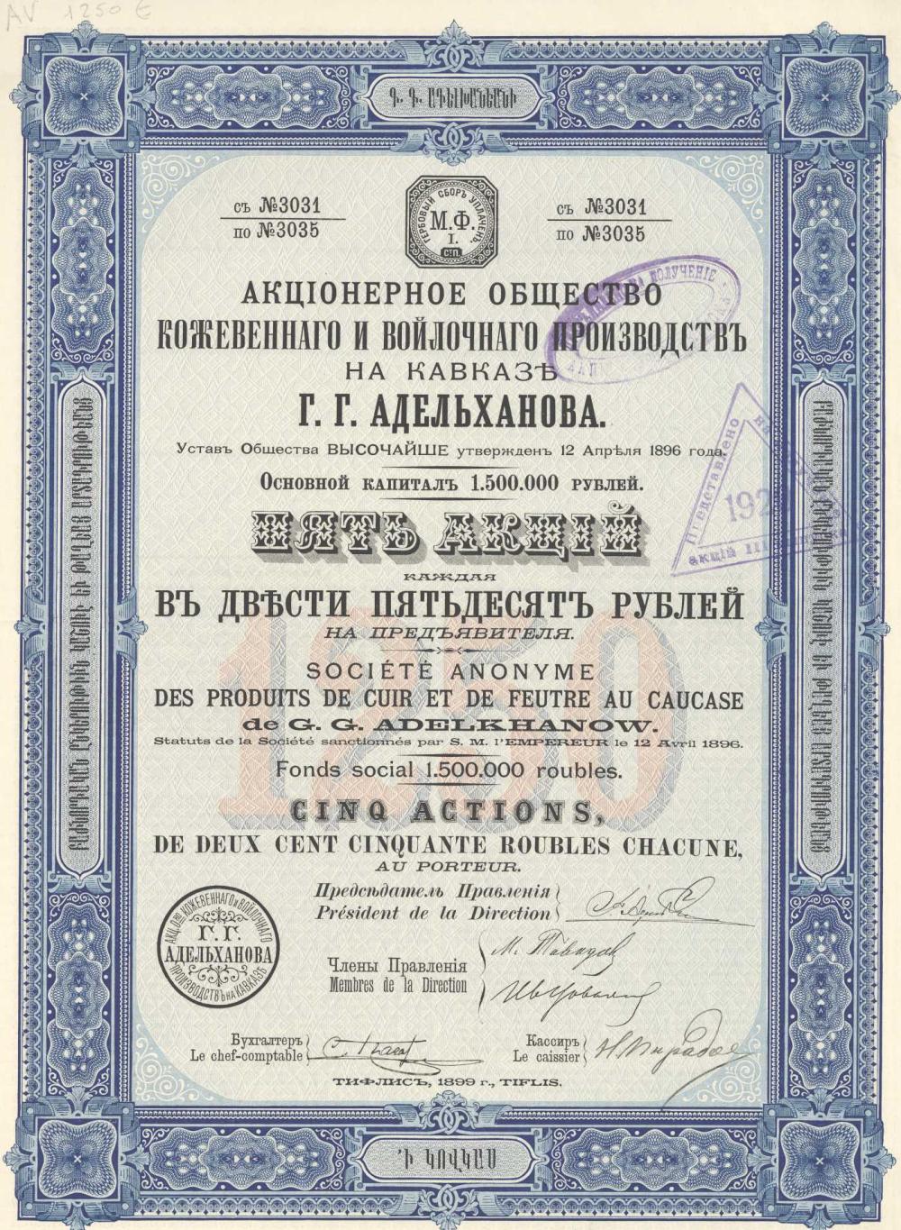 Formed in 1896 in Tiflis. Initial capital was 1,500,000 roubles in shares of 250 roubles. The company manufactured leather goods and felt products such as hats.