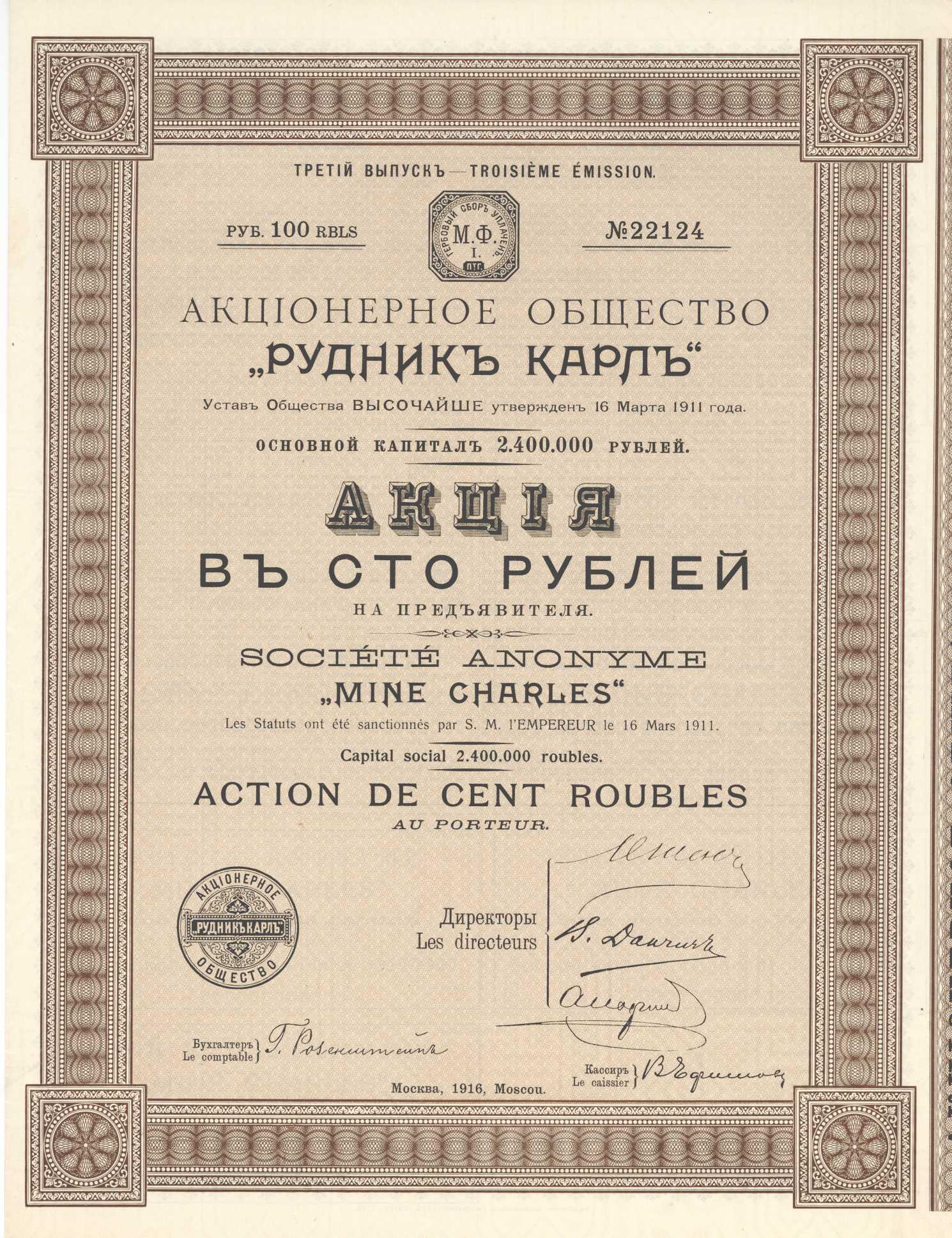 Formed in 1911 with head office in Moscow. By 1914, capital had reached 1,200,000 roubles in shares of 100 roubles. The company was founded by the Wogau trading house to provide their Moscow Cement Factory in Podolsk with anthracite coal. The mine was located in Ekaterinoslav, today known as Dnipro in eastern Ukraine. The company was later absorbed by the cement factory.