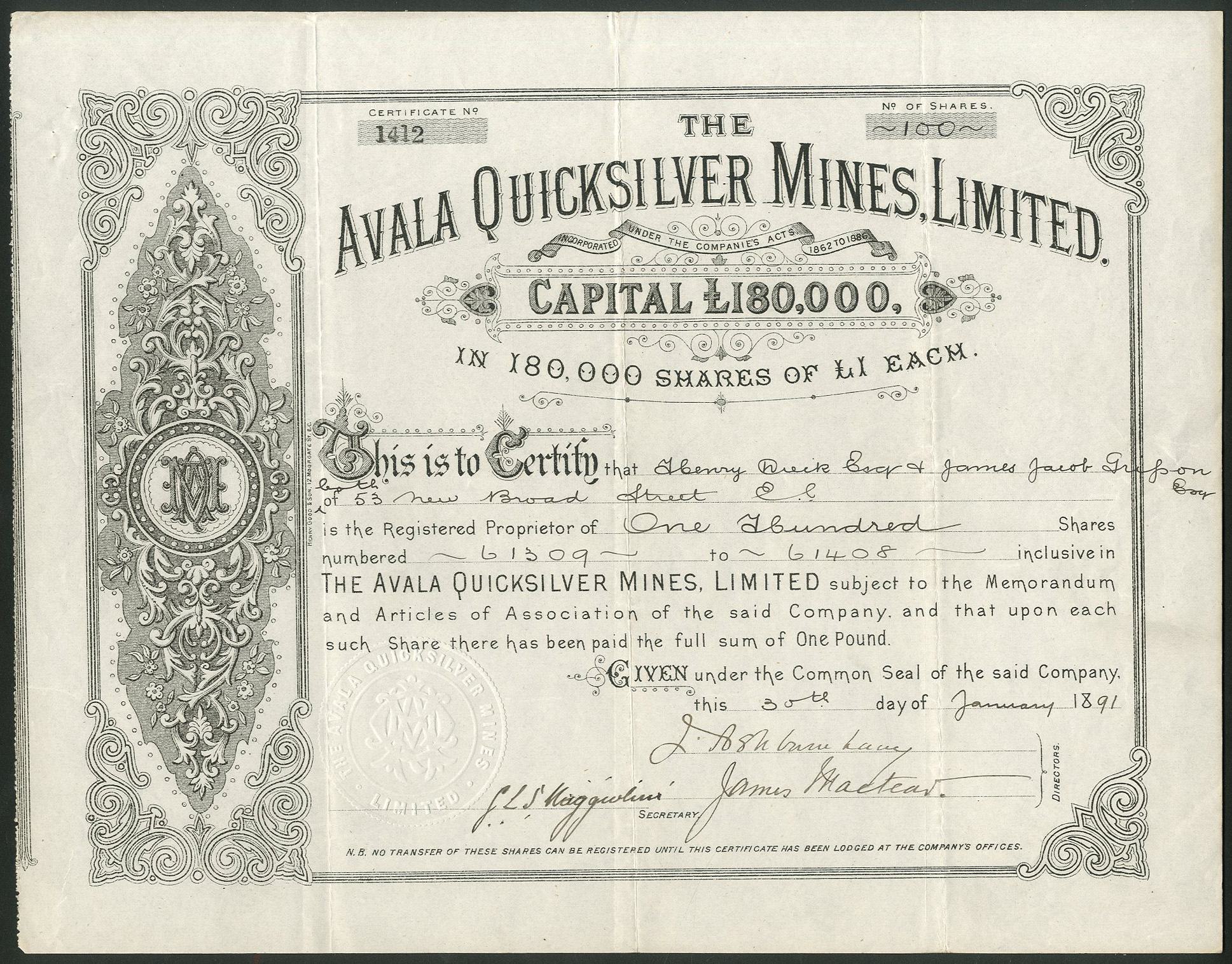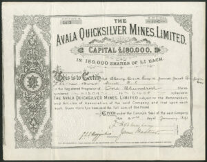 Registered 16th May 1889 to acquire the Avala Quicksilver Mines and Reduction Works and mining rights over 8500 acres at Mount Avala, near Belgrade, Serbia. Despite one of the Serbian vendors agreeing to fund more work at the mine over a 2 year period, the company found itself without further capital and it was wound up 29th December 1894. Company number 28932