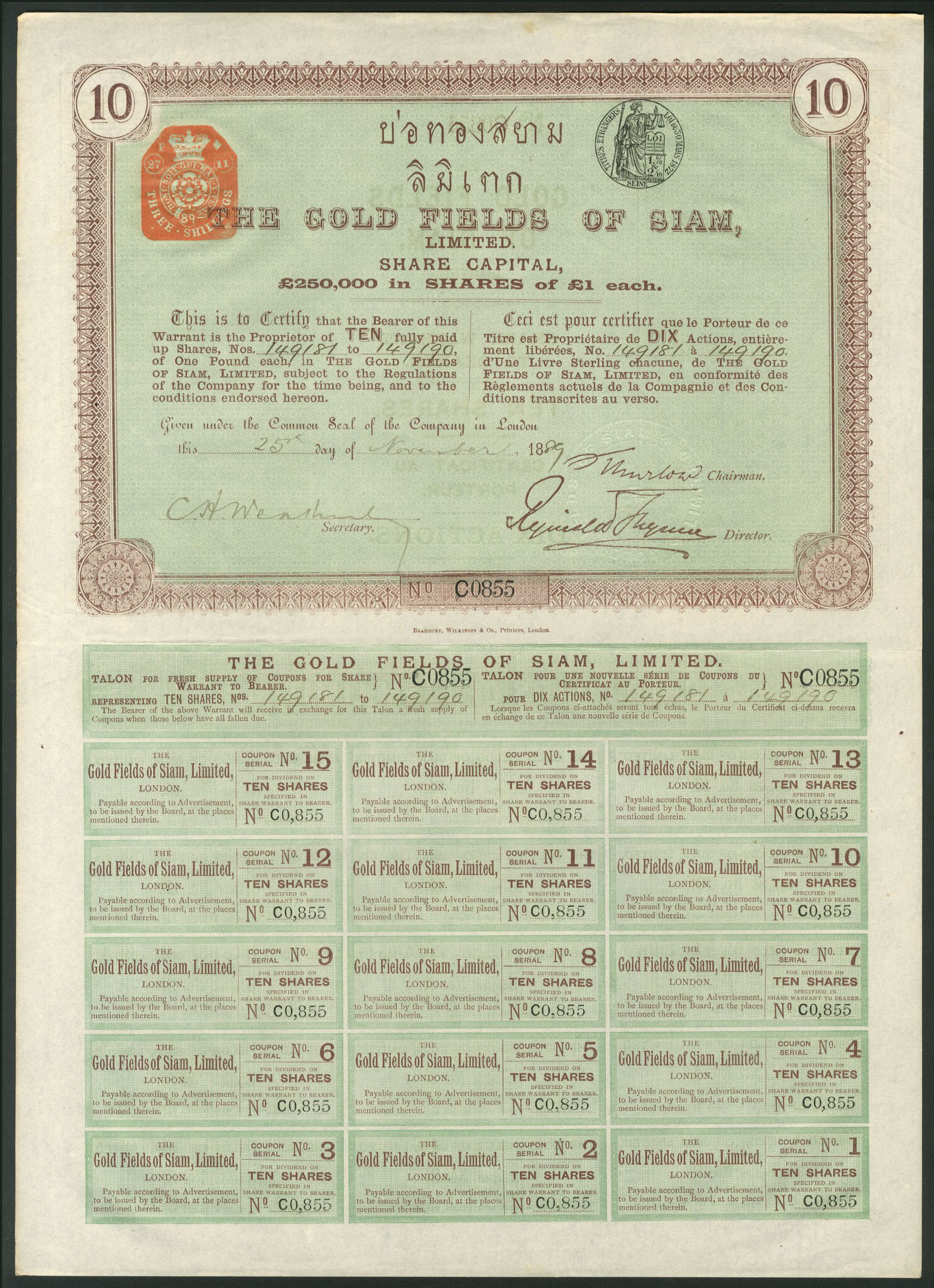 Registered 3rd May 1888 to acquire a concession for working mines in the Province of Bangtophan, Siam of about 15,000 acres. Struck off 18th November 1902. Company number 26628