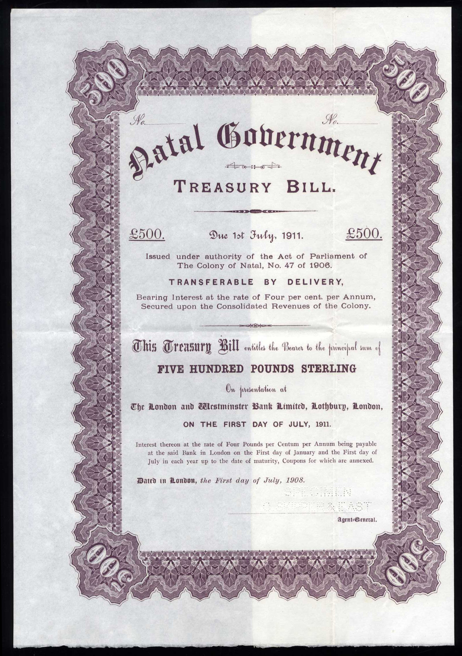 Natal: 1908 4% Treasury Bills