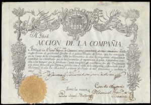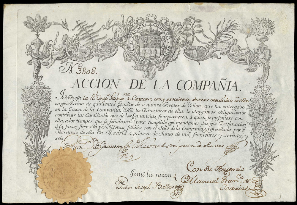 Formed by Spanish merchants to trade with the Caracas province of the colony of Venezuela and was the first of the great trading companies formed in Spain. A monopoly was obtained in 1732 which the company gradually abused by paying too little for its produce in Venezuela and overcharging for them on importation into Spain. The company’s privileges were reduced and it fell steadily into decline and in 1781 it lost its monopoly of trade altogether. It was absorbed into the Real Compania de Filipinas in 1785 and its shares were exchanged for those of the Filipinas Company.