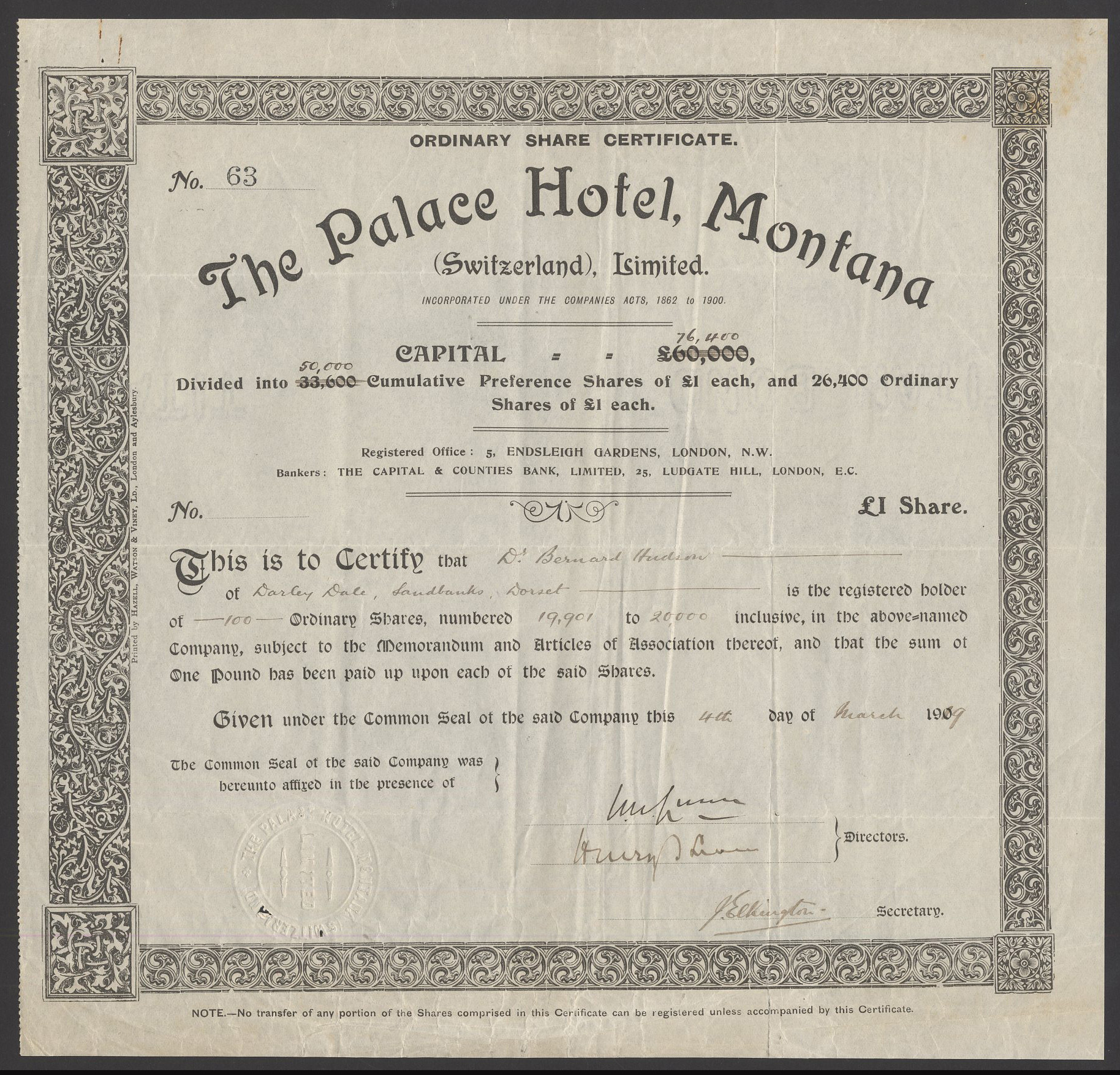 Registered 1906. Controlled by Sir Henry Simpson Lunn (1859-1939), founder of one of England’s largest travel companies, Lunn Poly. His first tours were in Switzerland in 1902 which led to his acquisition of this Hotel. Founded Alpine Sports Ltd. and the Alpine Ski Club. His company Sir Henry Lunn Travel merged with the Polytechnic Touring Association in the 1960’s to form Lunn Poly. Dissolved <1948. Company number 90208