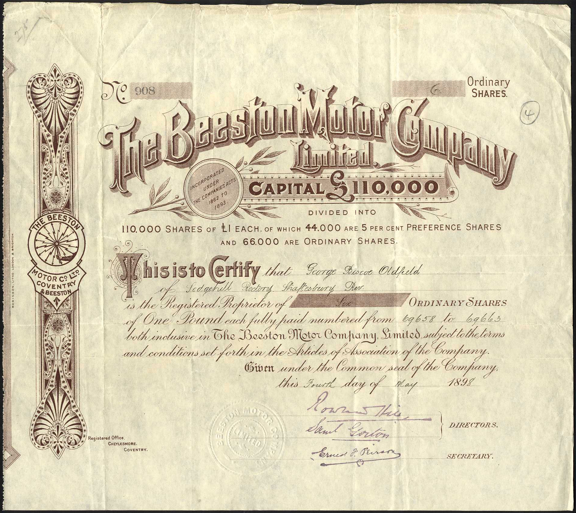 Registered 1897, Company number 51340. Re-registered later in the year number 54692. The Beeston companies, Beeston Motor, Beeston Tyre and Beeston Cycle, formed part of the Harry Lawson Group. These companies operated from the Quinton Works in Parkside, Coventry, until the group was either wound up or reorganized at the turn of the 20th century. During World War I, the factory produced munitions for the war effort and engines for Hispano-Suiza and Renault aircraft. The Swift Motor Company took over the premises which is now the Ibis Hotel. Dissolved <1916.