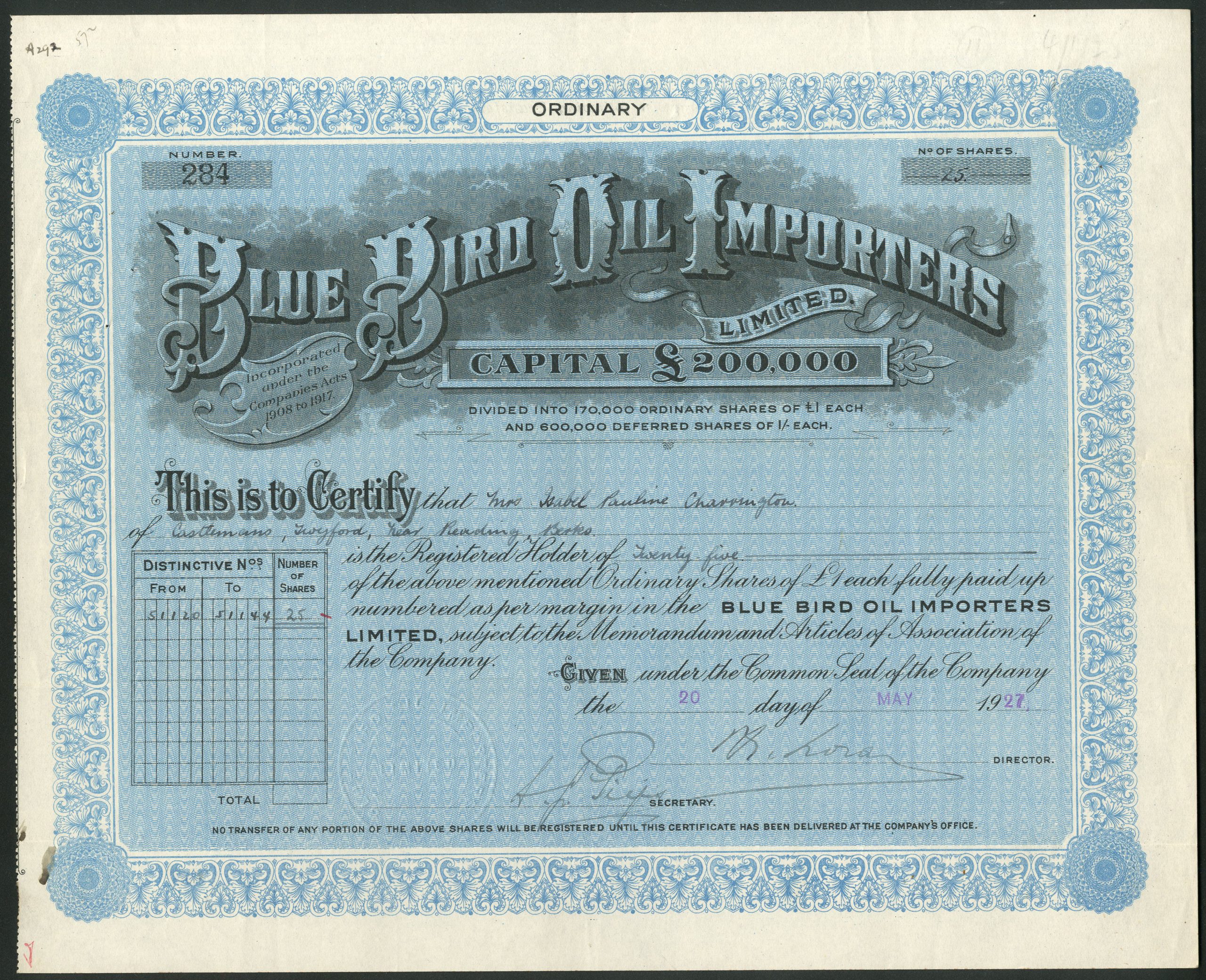 Registered 1927. Some certificates signed by Francis Lorang as director and A.J.Picjus as Secretary. The first pair have a facsimile signature of Picjus. Lorang was accused and charged of false accounting and using company funds of the Blue Bird Group for his own use. He was arrested in Paris in 1930 and sentenced to 7 years imprisonment. <1950. Company number 220384