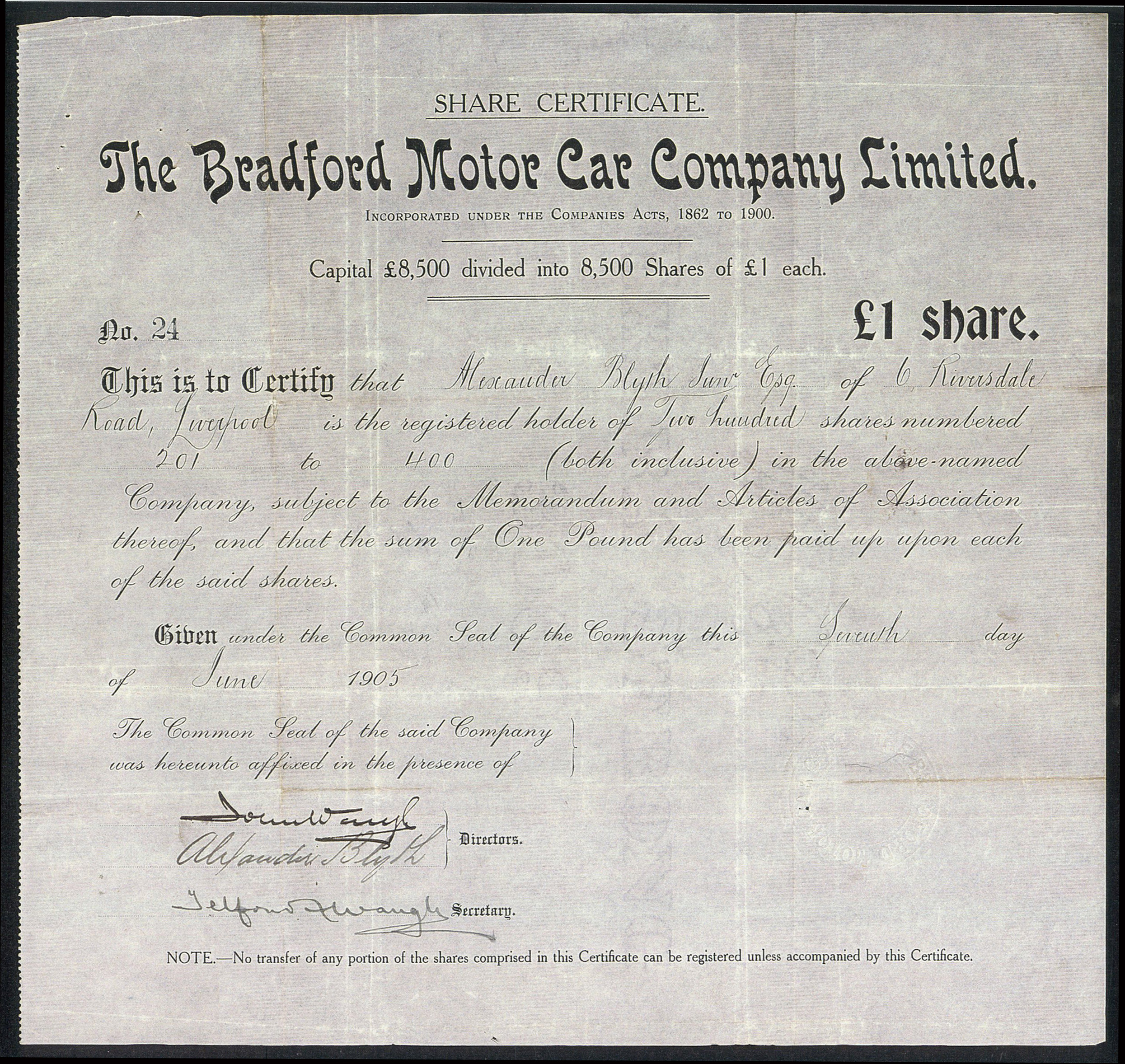 Registered 1905. Company number 83983. Motor car dealers in Bradford, Yorkshire that seem to have been established in about 1898. In liquidation in 1907.