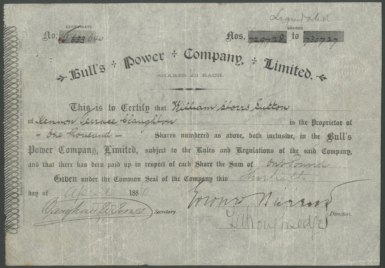 Registered 1883 by H. C. Bull, an American who came to England in 1879 from New York. The company was involved in a gas powered engine. Dissolved <1916. Company number 18684
