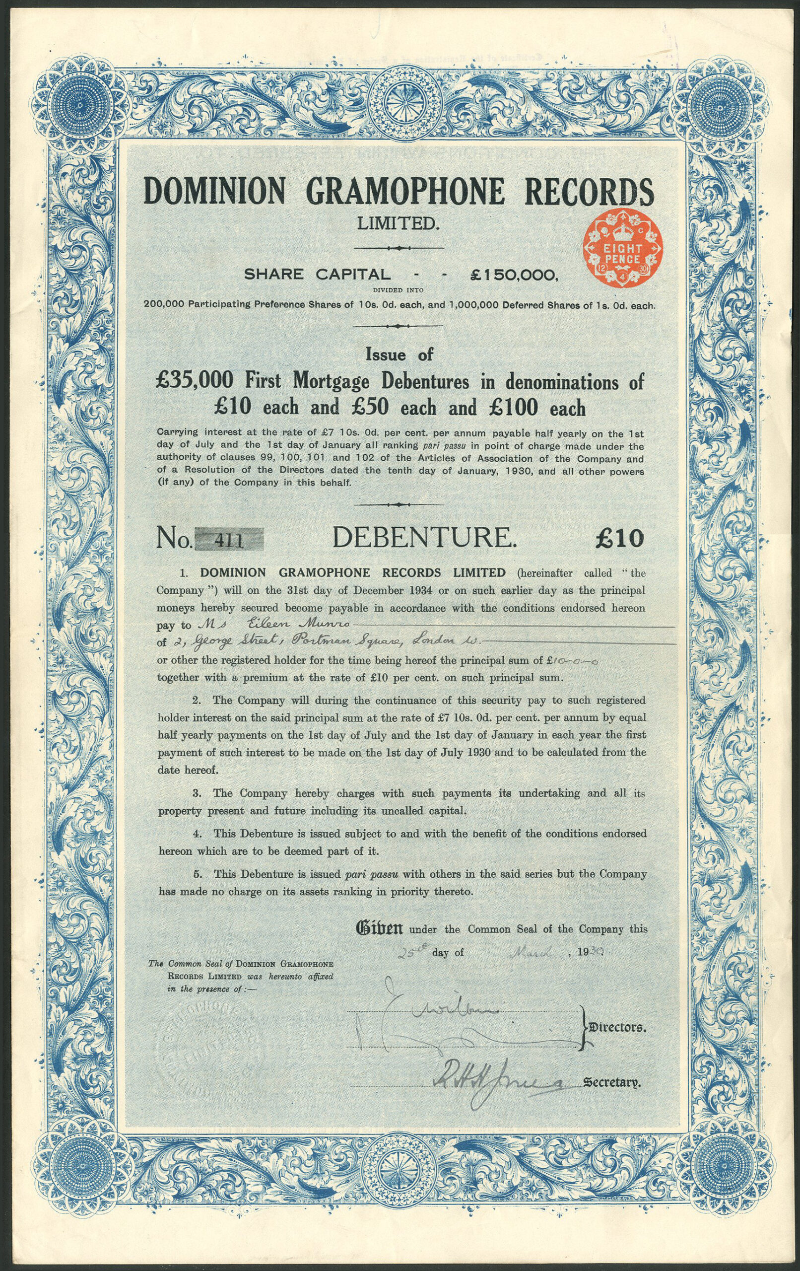 Capital £150,000 in 200,000 10% Participating Preference shares of 10/- and 1,000,000 Deferred shares of 1/-