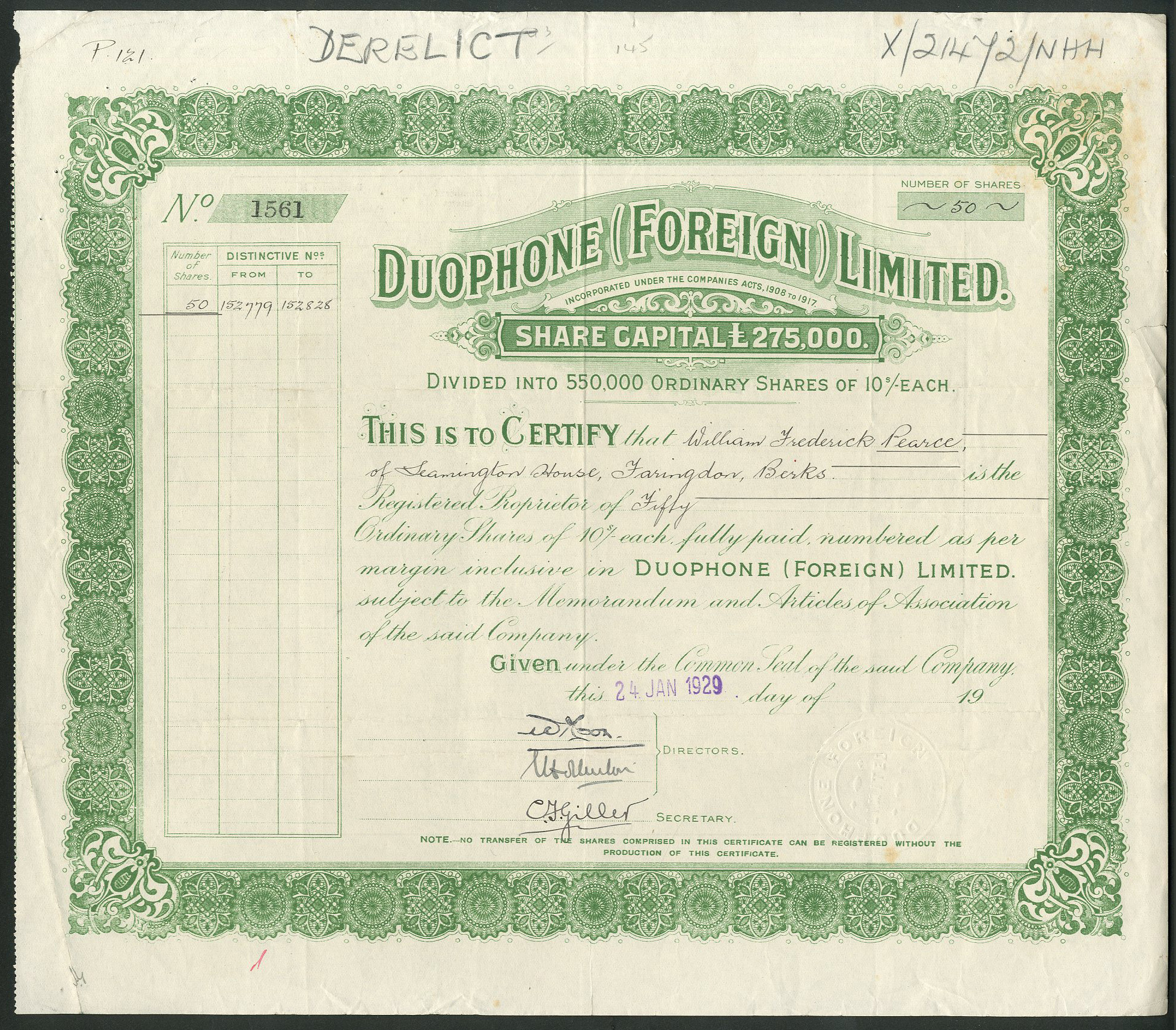 £275,000 share capital issued in 550,000 shares of 10/- each in 1928/29.