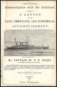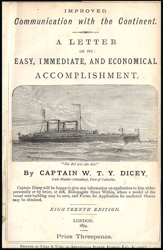 The company built the ‘Castalia’, a double hulled paddle steamer specially designed by Captain W. T. Y. Dicey for the cross Channel service between Dover and Calais. Sea sickness was a great problem and the design was intended to alleviate this problem. Dicey was a former Harbour Master at the Port of Calcutta and was taken with the small catamarans that were in use in the region and that gave him the idea for this design. Essentially the ship was made from two half-hulls which were joined together and paddle wheels were in the centre. The ship was made the same at both ends so there was no need for turning round for the return journey. Slower than expected the ship was immediately refitted but was not a financial success and was sold for use as a hospital ship on the Thames in 1883.