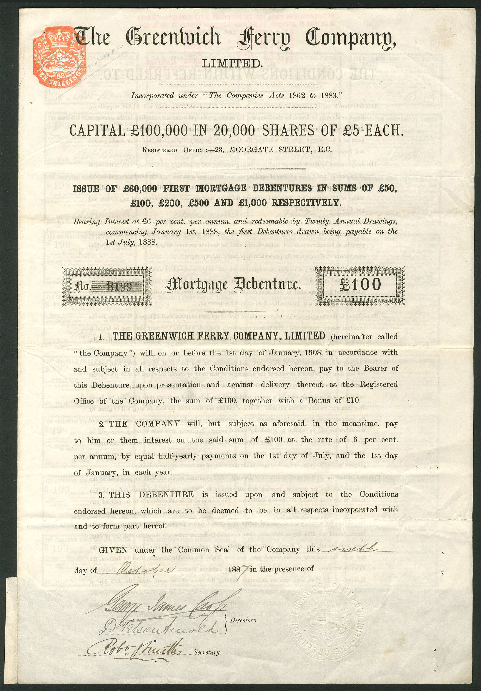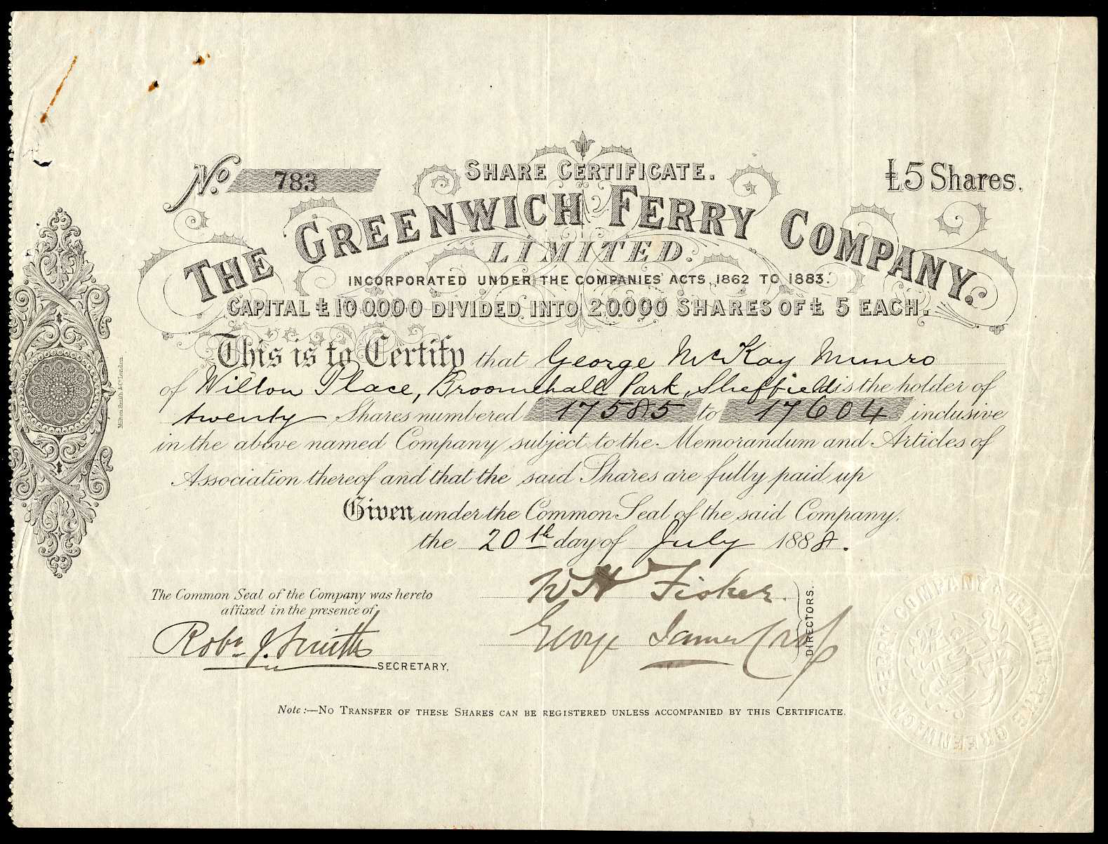 Registered 1886. Formed to acquire the ancient ferry rights originally granted by James Ist, for a service between Greenwich and the Isle of Dogs in London. Appears to have been re-registered in 1890. Dissolved <1916. Company number 22075