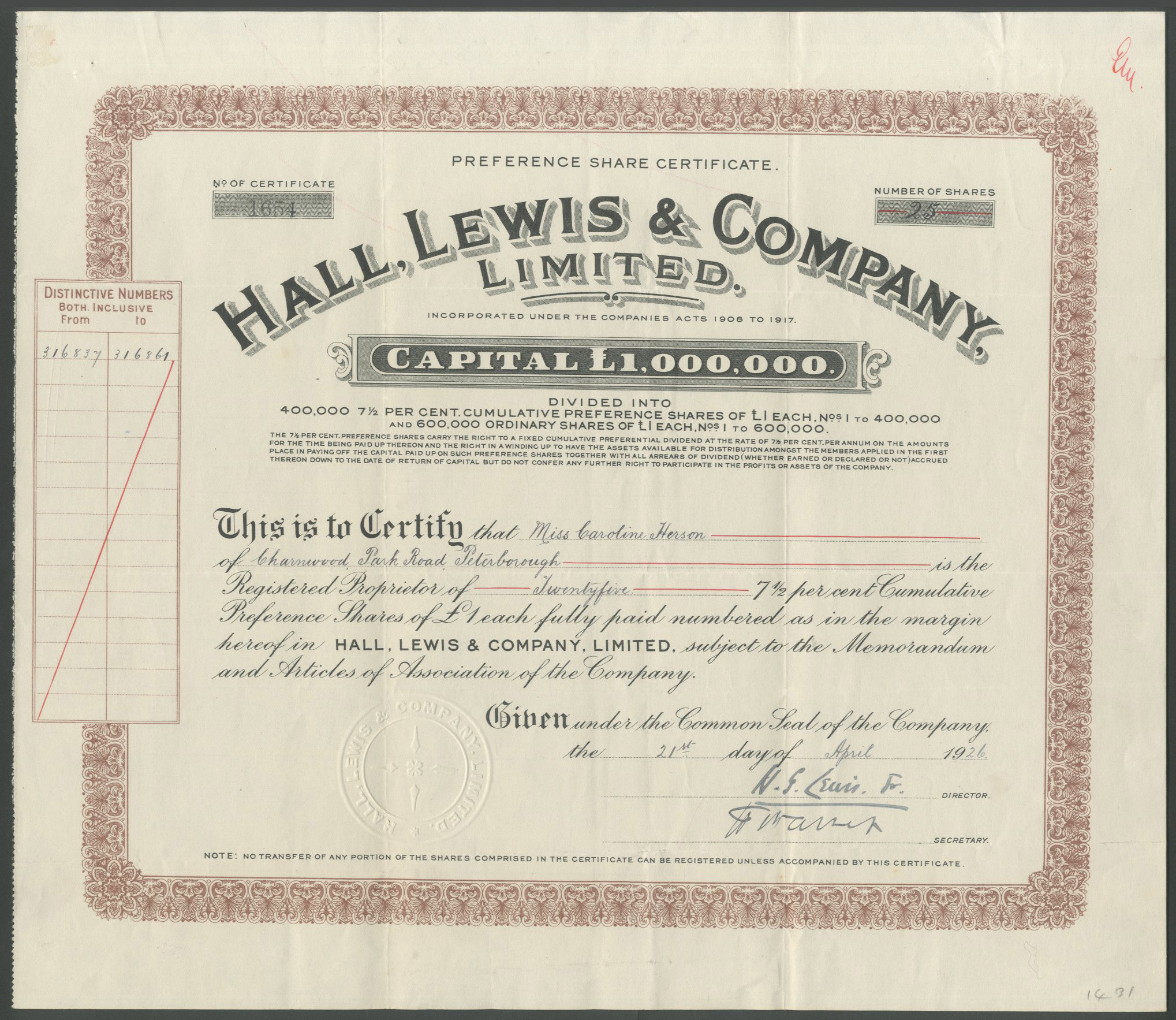 Capital £1,000,000 in 400,000 7½% Cumulative Preference shares of £1 and 600,000 ordinary shares of £1.
