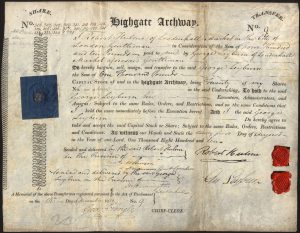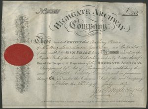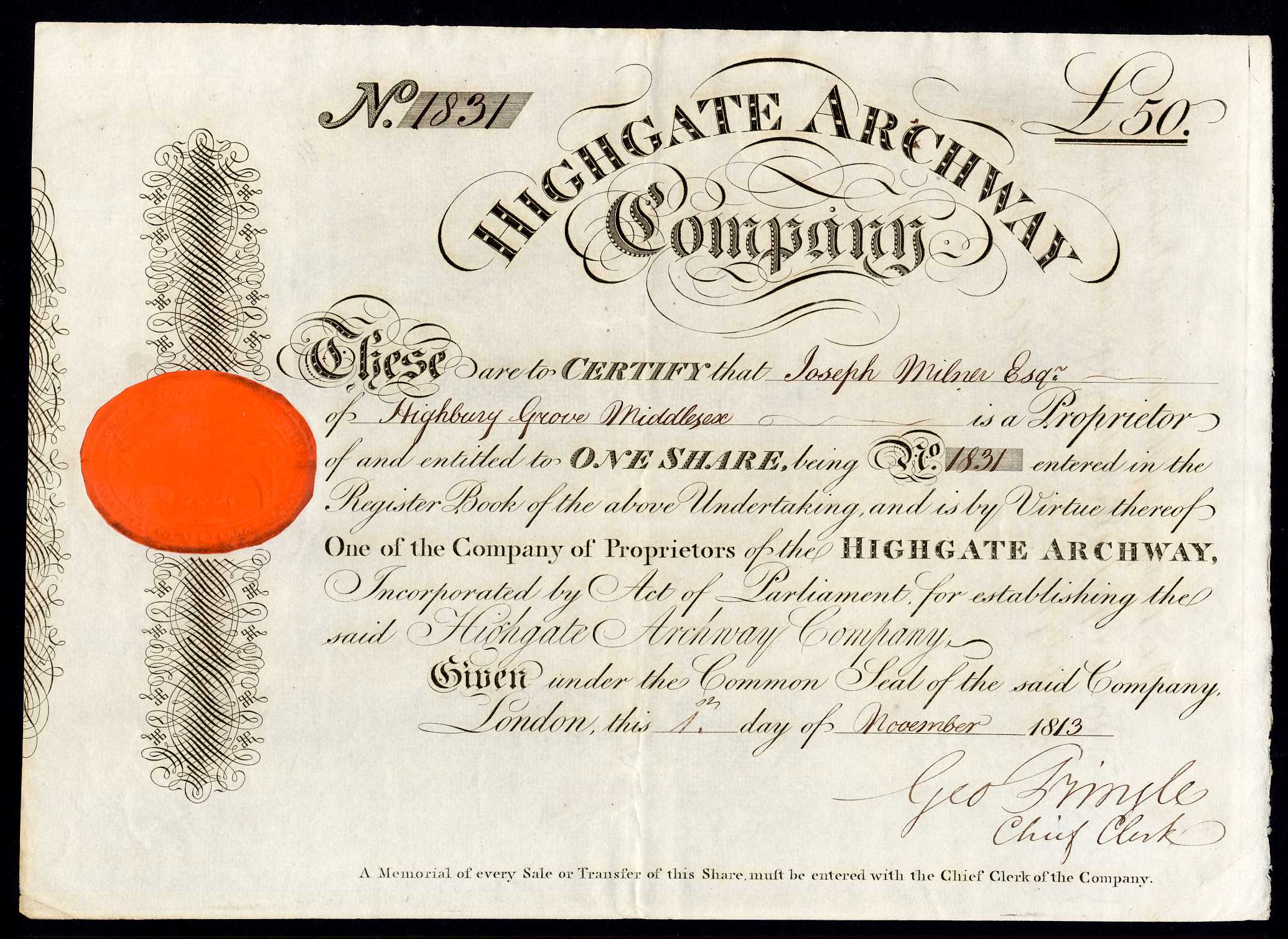 Formed by 1810 to cut a tunnel through the steep hill at Highgate, North London, which collapsed when almost complete, forming the present cutting. The company then built the bridge across, which was rebuilt at the turn of the century.