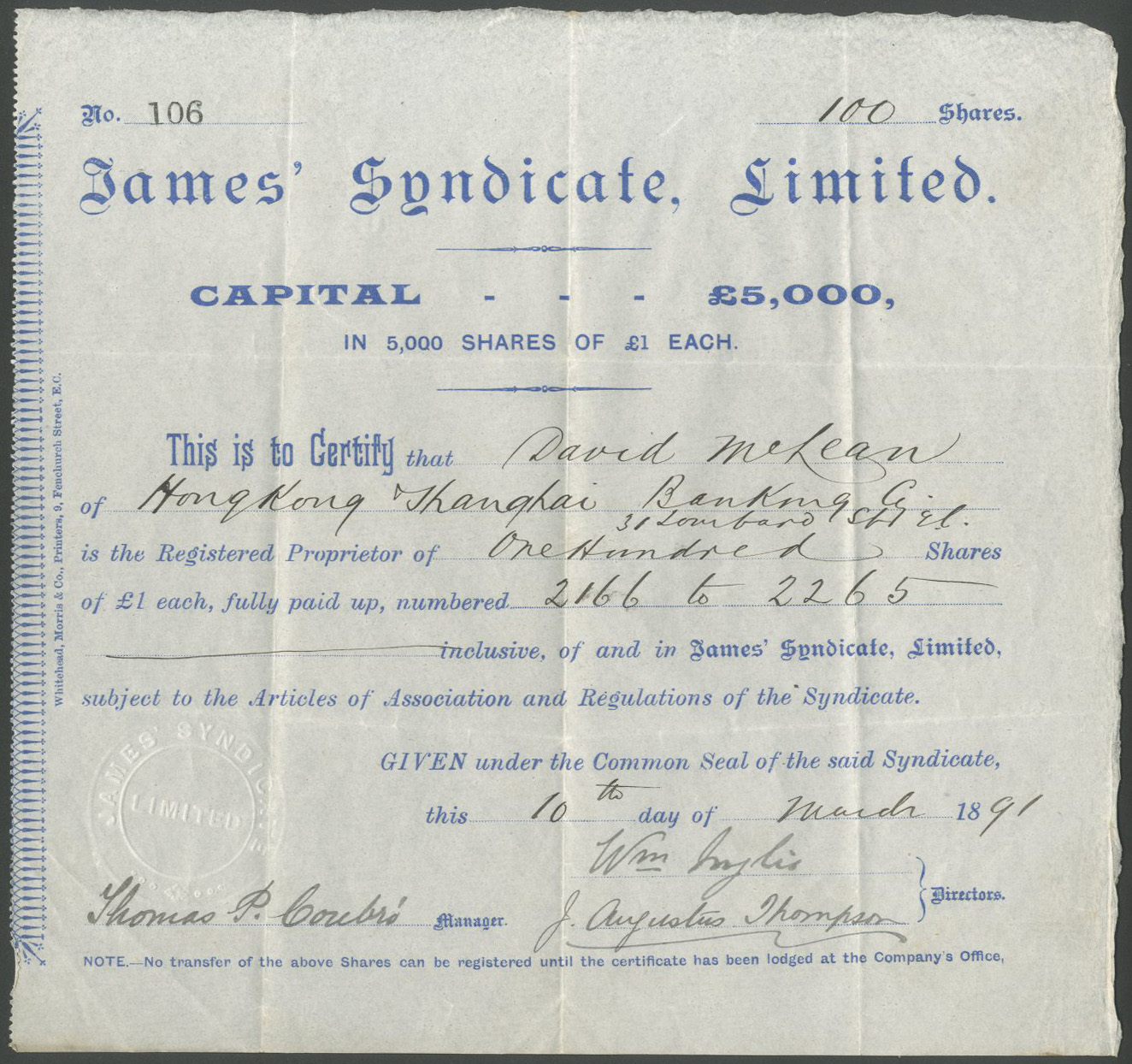 | 101 | £1 shares | 18[91], blue | #106 | £30 |