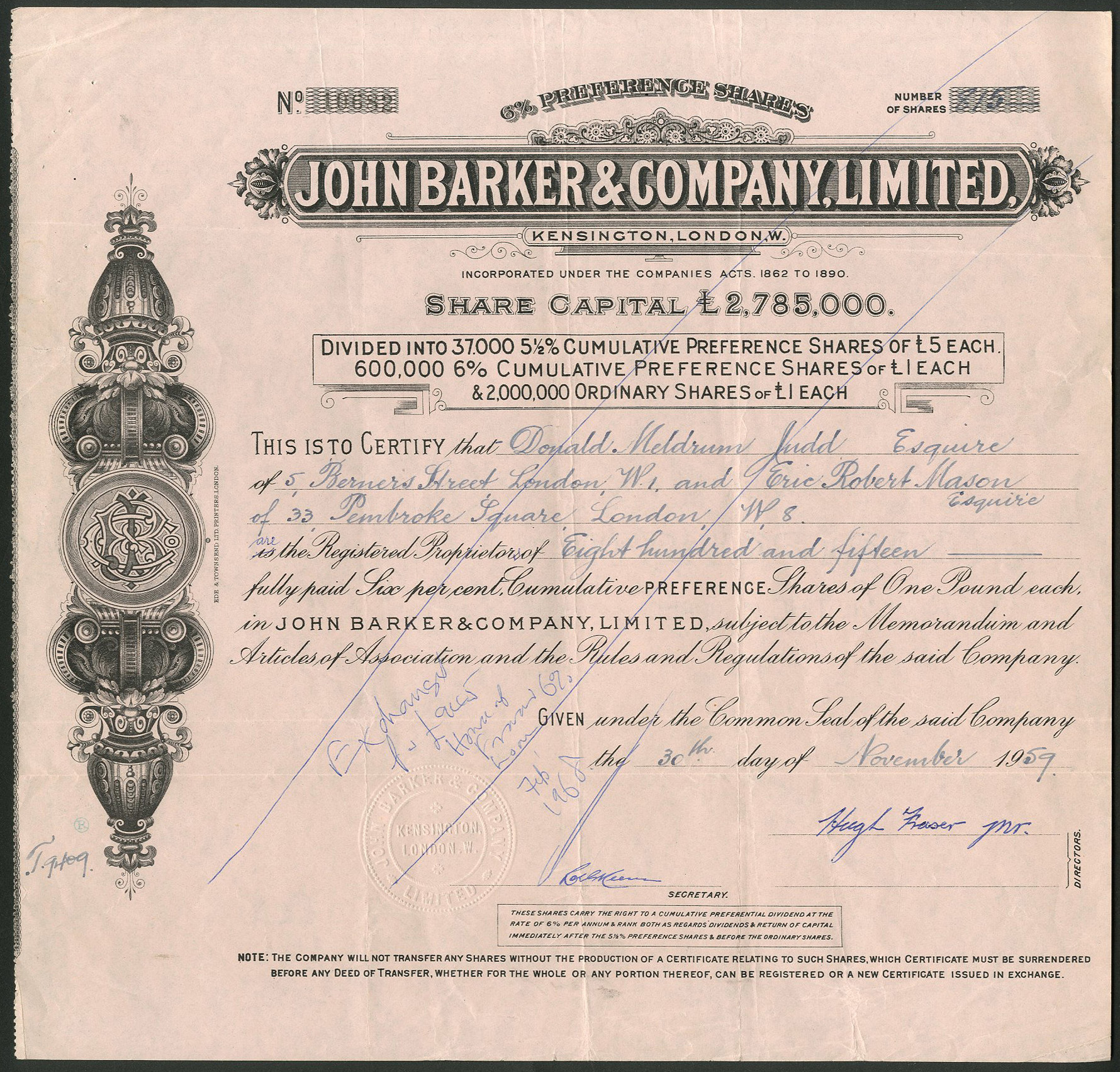 Capital £2,230,000 in 37,000 5½% Cumulative Preference shares of £5, 600,000 6% Cumulative Preference shares of £1 and 1,445,000 Ordinary shares of £1. Increased to £2,785,000 by the issue of more ordinary shares.