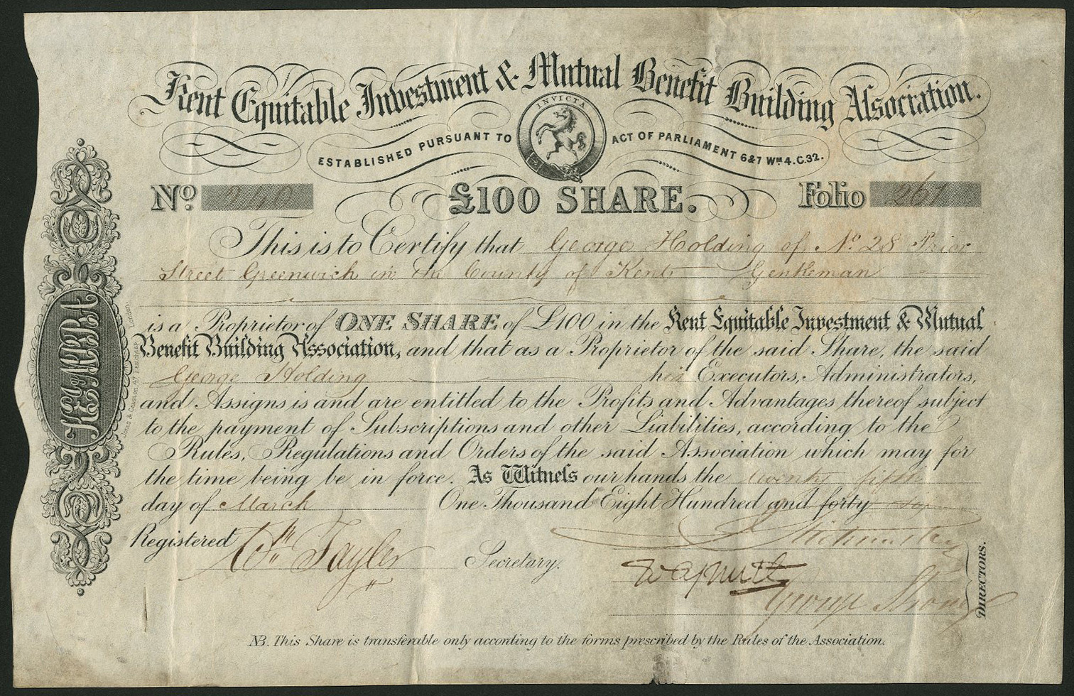 | 101 | 1 share | 18[44], black, on vellum | #240 | VF | £120-150 |