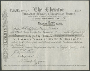 Formed in 1868 by Jabez Spencer Balfour. It became the largest society in the country by the 1890s acquiring funds from its many temperance and non-conformist customers. Balfour formed other companies in the building and land sectors to work with the society and by the 1880’s most mortgages were to finance speculative developments by these companies. He also formed a bank which collapsed in 1892 closely followed by his other companies. The Liberator also collapsed in 1892 which led to new laws governing such societies.