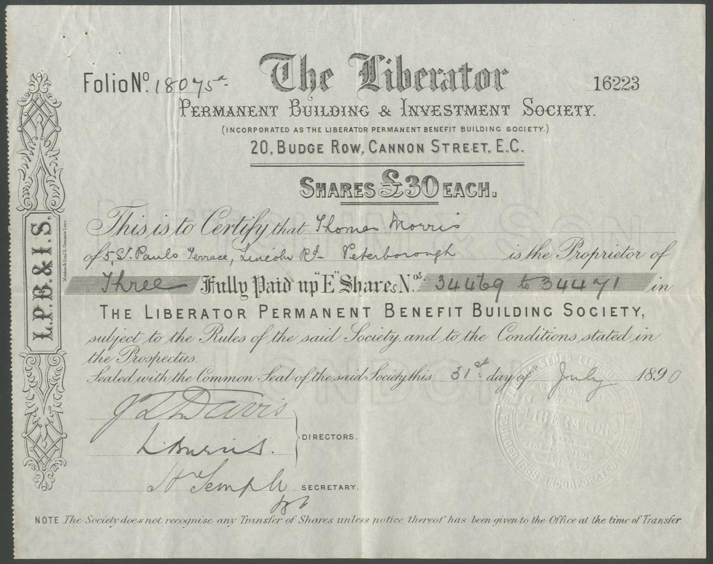 Formed in 1868 by Jabez Spencer Balfour. It became the largest society in the country by the 1890s acquiring funds from its many temperance and non-conformist customers. Balfour formed other companies in the building and land sectors to work with the society and by the 1880’s most mortgages were to finance speculative developments by these companies. He also formed a bank which collapsed in 1892 closely followed by his other companies. The Liberator also collapsed in 1892 which led to new laws governing such societies.