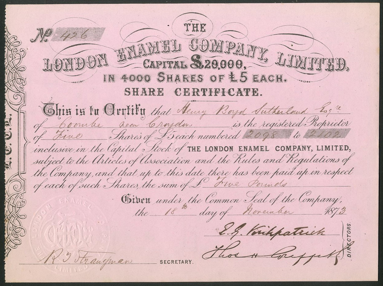 | 101 | £5 shares | 187[3], black on pink paper | #426,#427 | £30 |