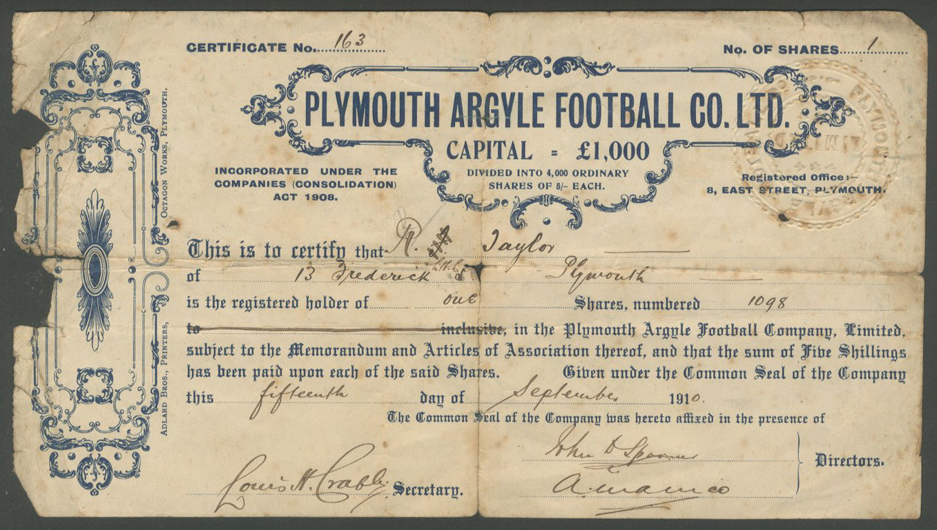 Registered 1903 and re-registered in 1909. The club was originally founded as Argyll Football Club in 1886 but turned professional in 1903 and the name changed to Plymouth Argyle. This company dissolved by 1916 as the club passed to new owners. Company number 77062. The club still exists and plays in League One.