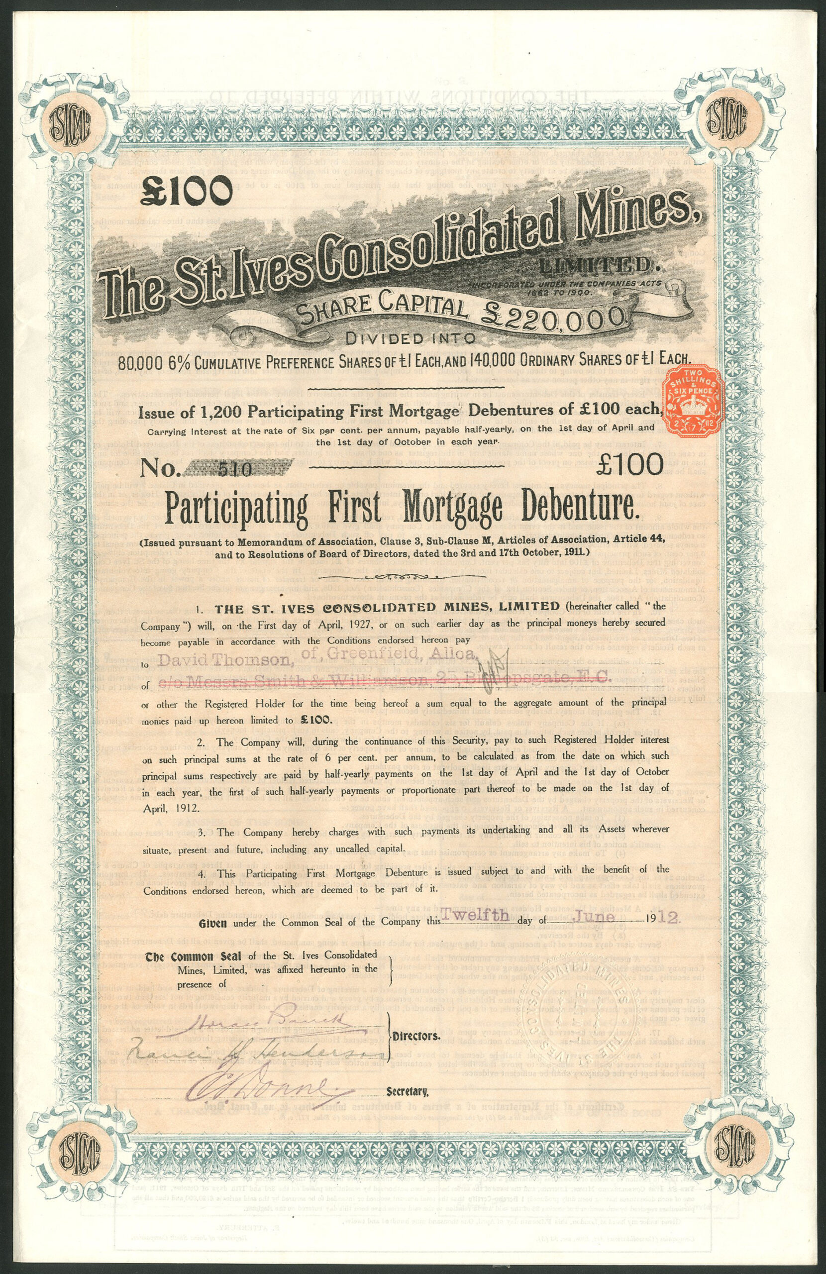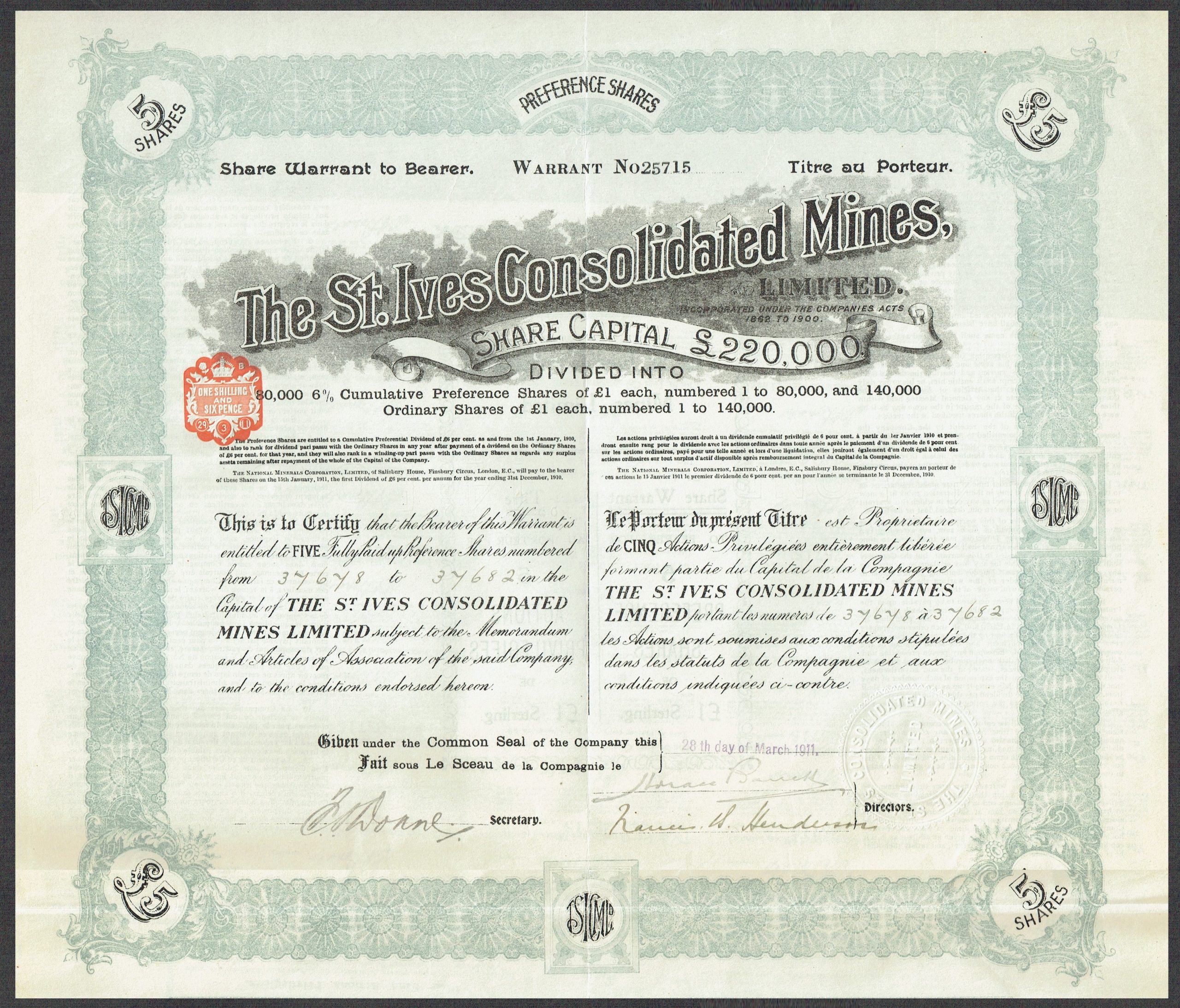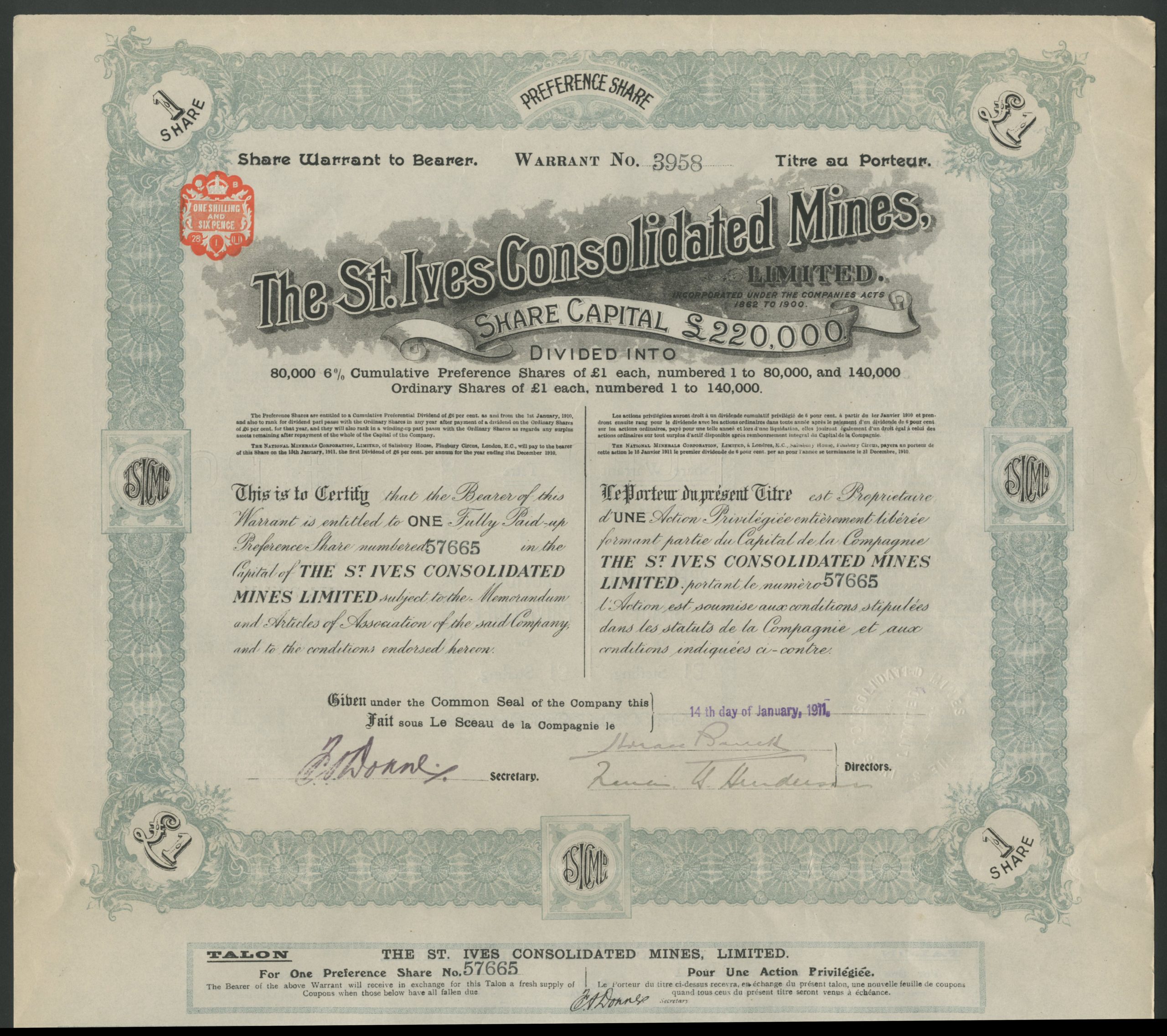 Capital £220,000 in 80,000 6% Cumulative Preference shares and 140,000 Ordinary shares of £1.