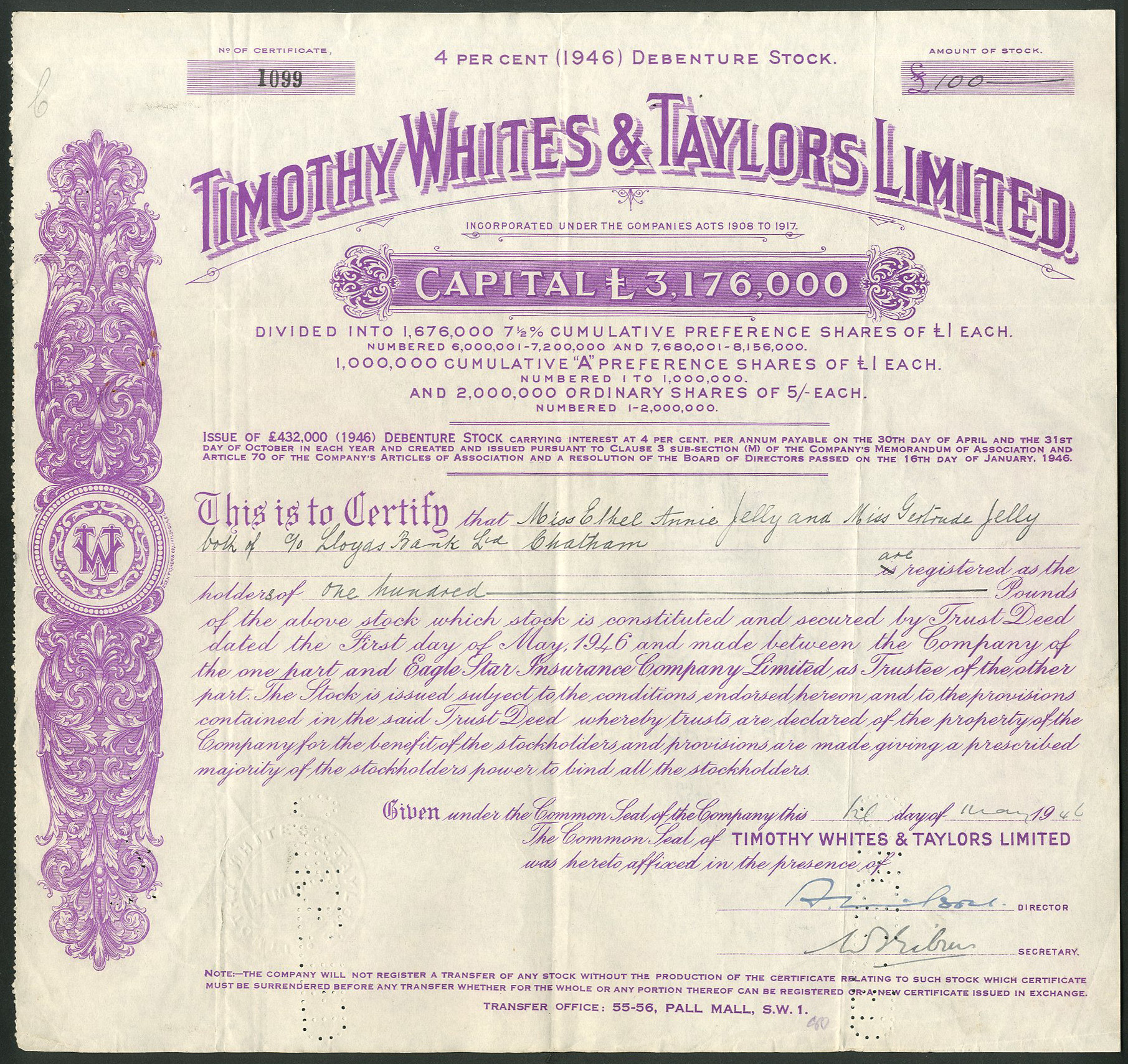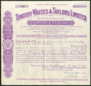 Formed in 1934 by the merger of Timothy Whites with Taylors drug Company Limited, Taylors (Cash Chemists) Trust Limited, Taylors (Cash Chemists) London Limited and Taylors (Cash Chemists) Midland Limited.