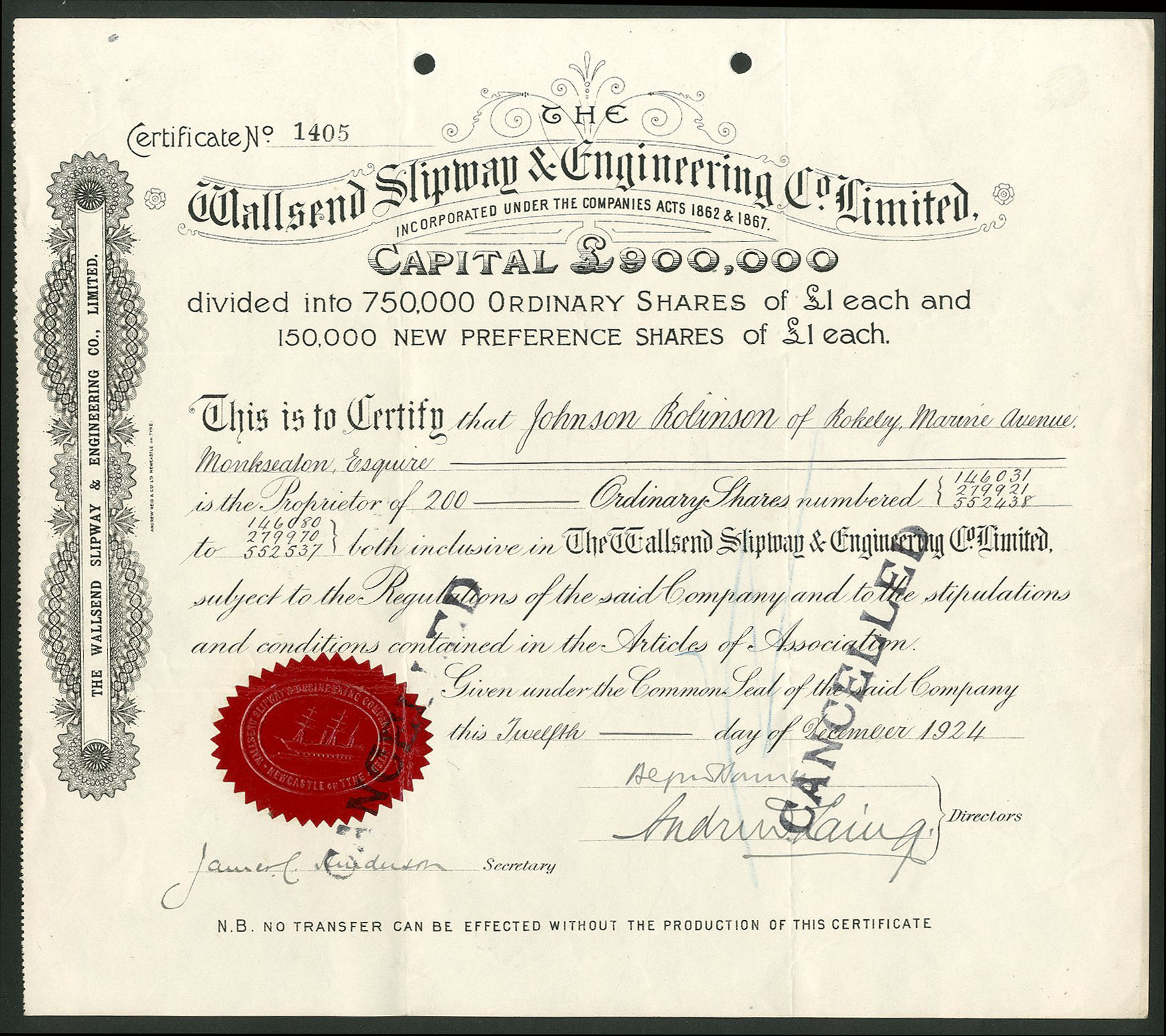 Registered 2nd October 1871 as Wallsend Slipway Co. Ltd., name changed in 1878.