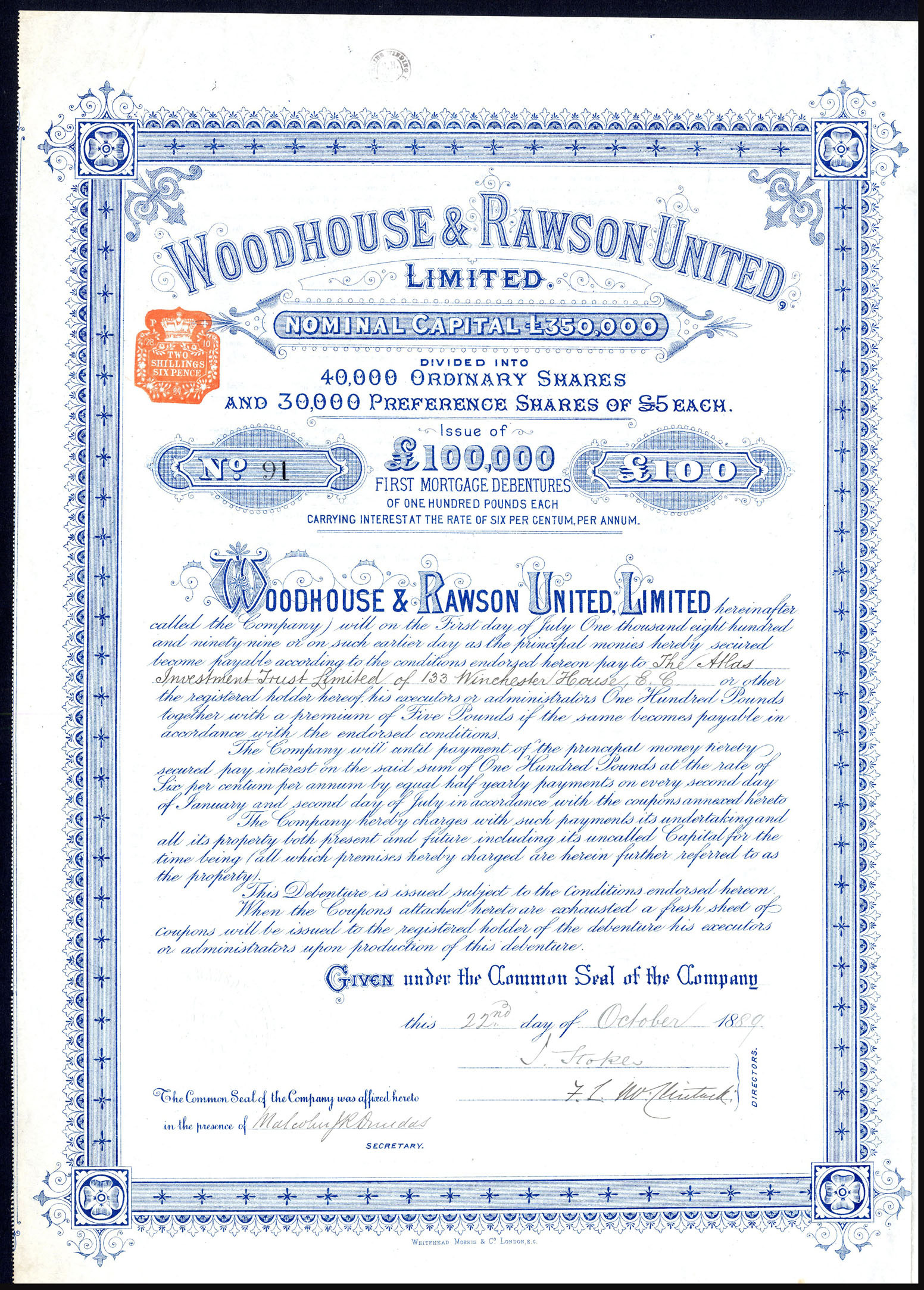Capital £350,000 in 40,000 ordinary shares of £5 and 30,000 preference shares of £5.
