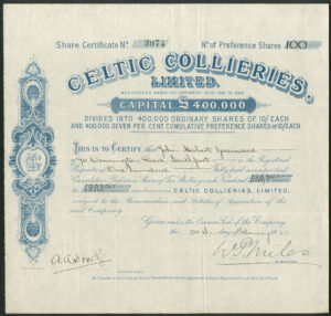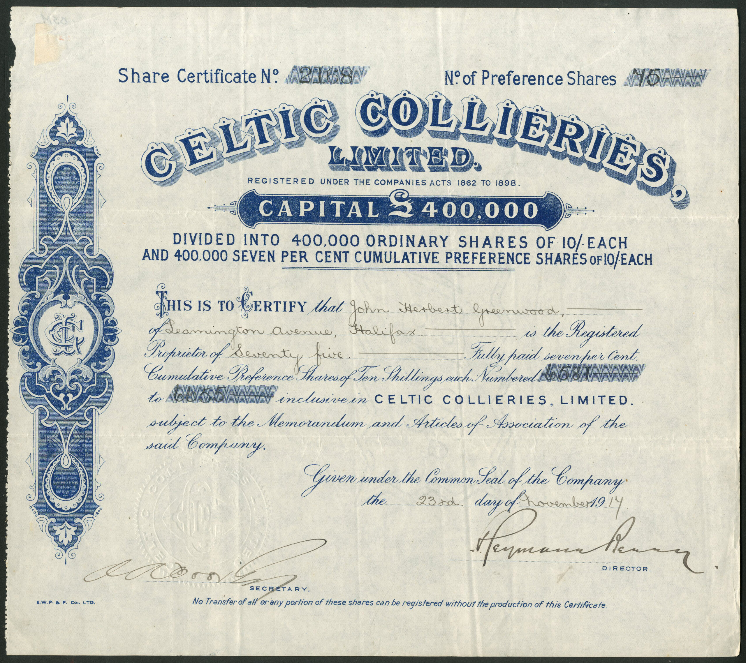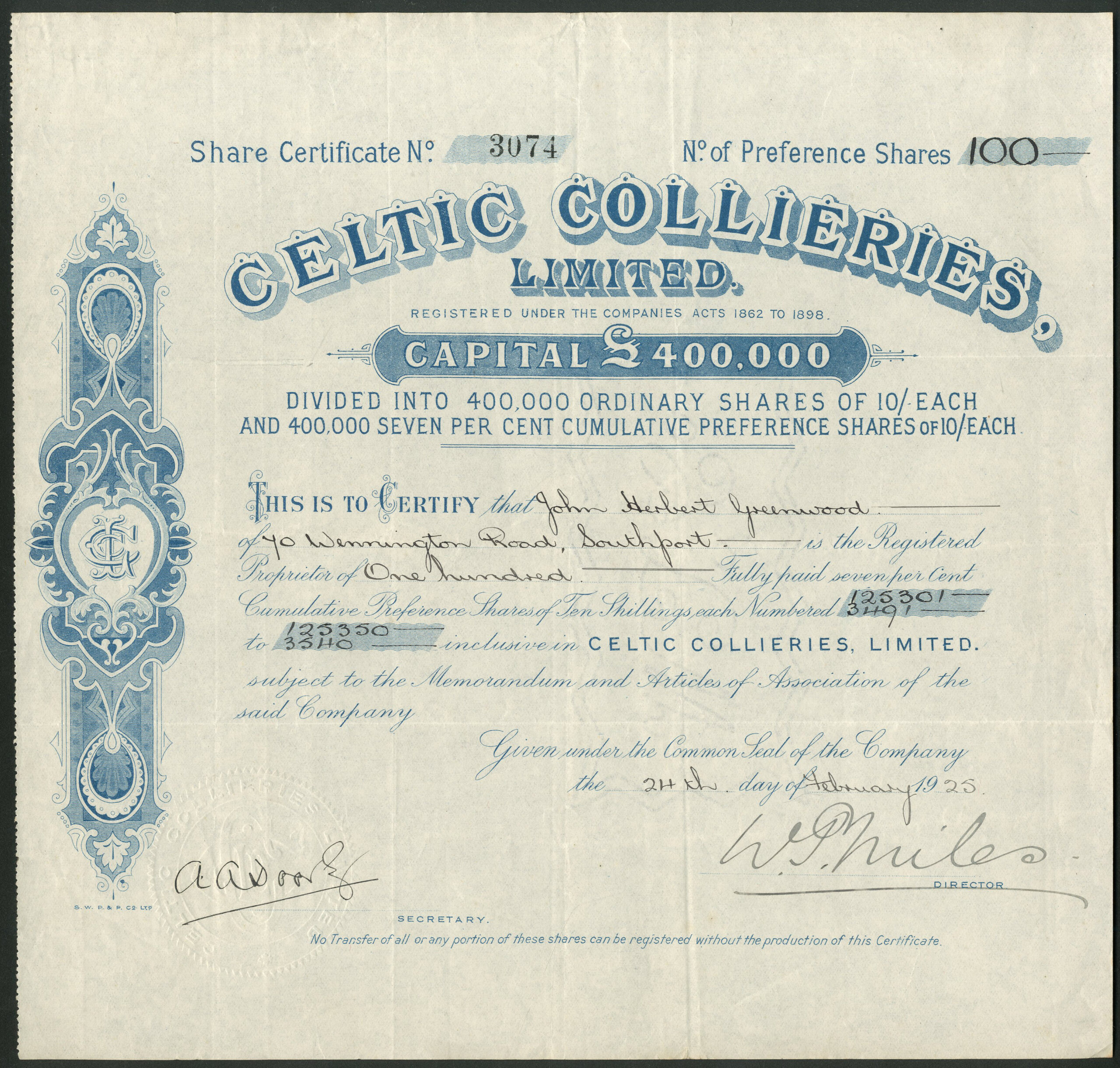 Capital £400,000in 400,000 ordinary shares of 10/- and 400,000 7% cumulative preference shares of 10/-.