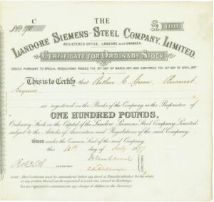 Registered 1870 by Carl Wilhelm Siemens, the brother of Werner von Siemens. The company owned a steel production plant in Landore, near Swansea in Wales. In 1871 the company had an weekly output of 1,000 tons of steel. In 1888, five years after the death of Carl Wilhelm Siemens, the company went into voluntary liquidation. The plant was taken over by the American locomotive constructer Messrs. Baldwin & Co. Company number 4916