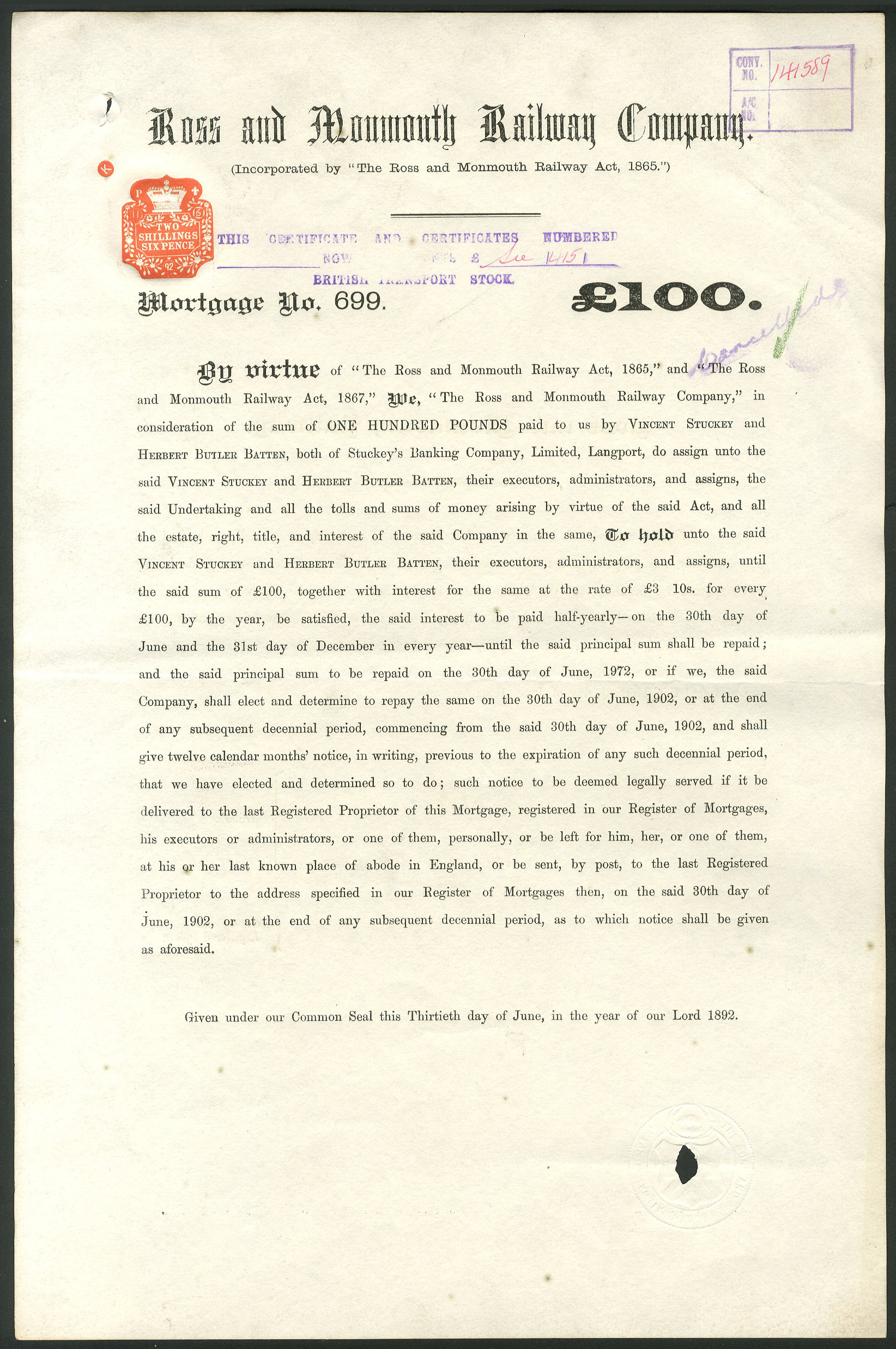 Incorporated on 5th July 1865. A 12 mile line connecting the towns, and forming a connection between the Hereford, Ross and Gloucester and the Coleford, Monmouth, Usk and Pontypool Railways. It opened in 1873, and passed to the Great Western Railway in 1922.