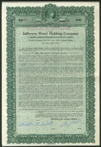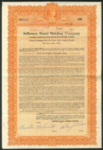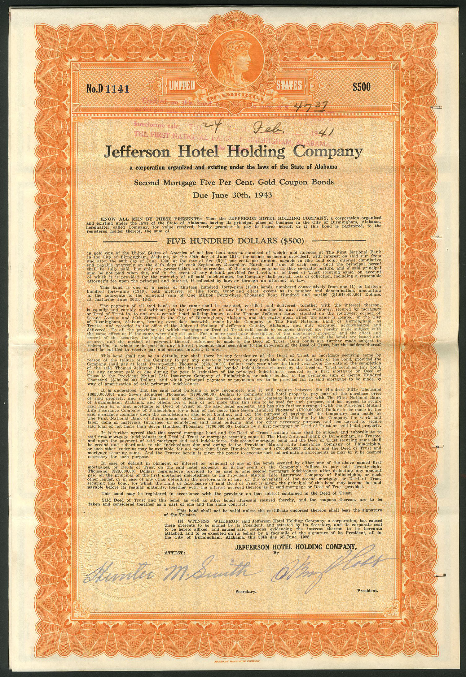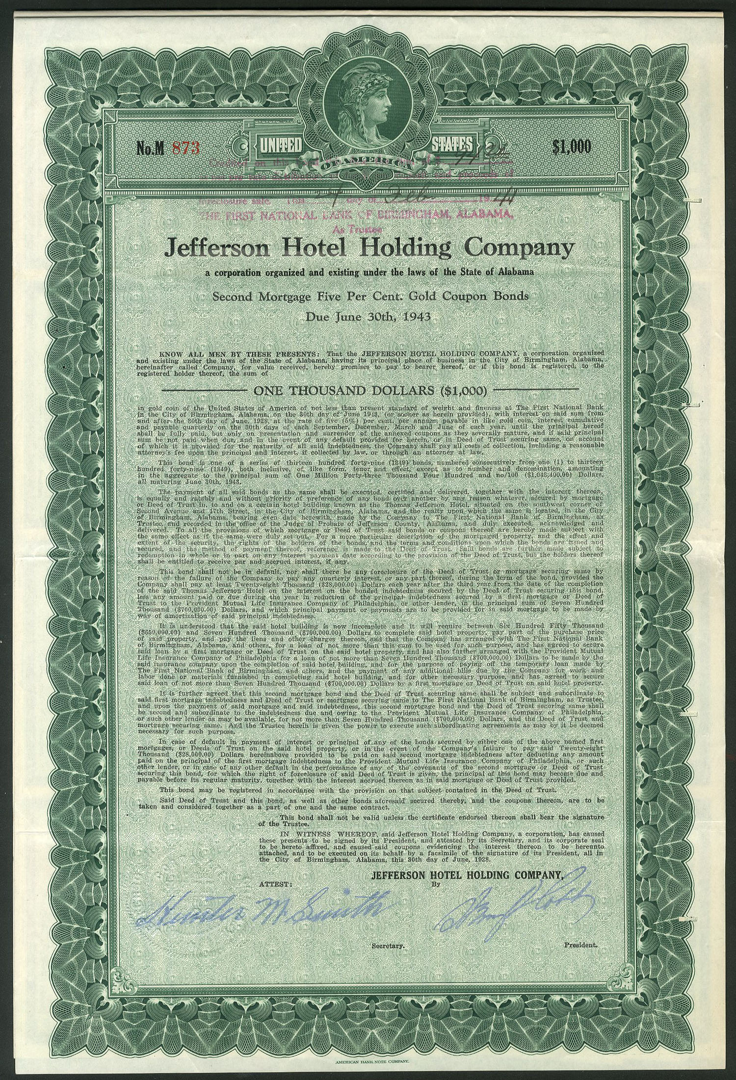 Incorporated in Alabama in 1928 to refinance the 350 room Thomas Jefferson Hotel in Birmingham Alabama, part f the Baker Chain of Hotels. Insolvent by 1935. The Hotel passed to new owners and fell into decline in the 1970’s and only opened as recently as 2017 as the Thomas Jefferson Tower of 100 apartments.