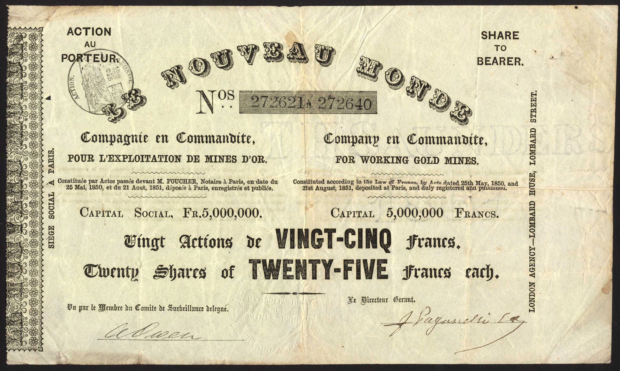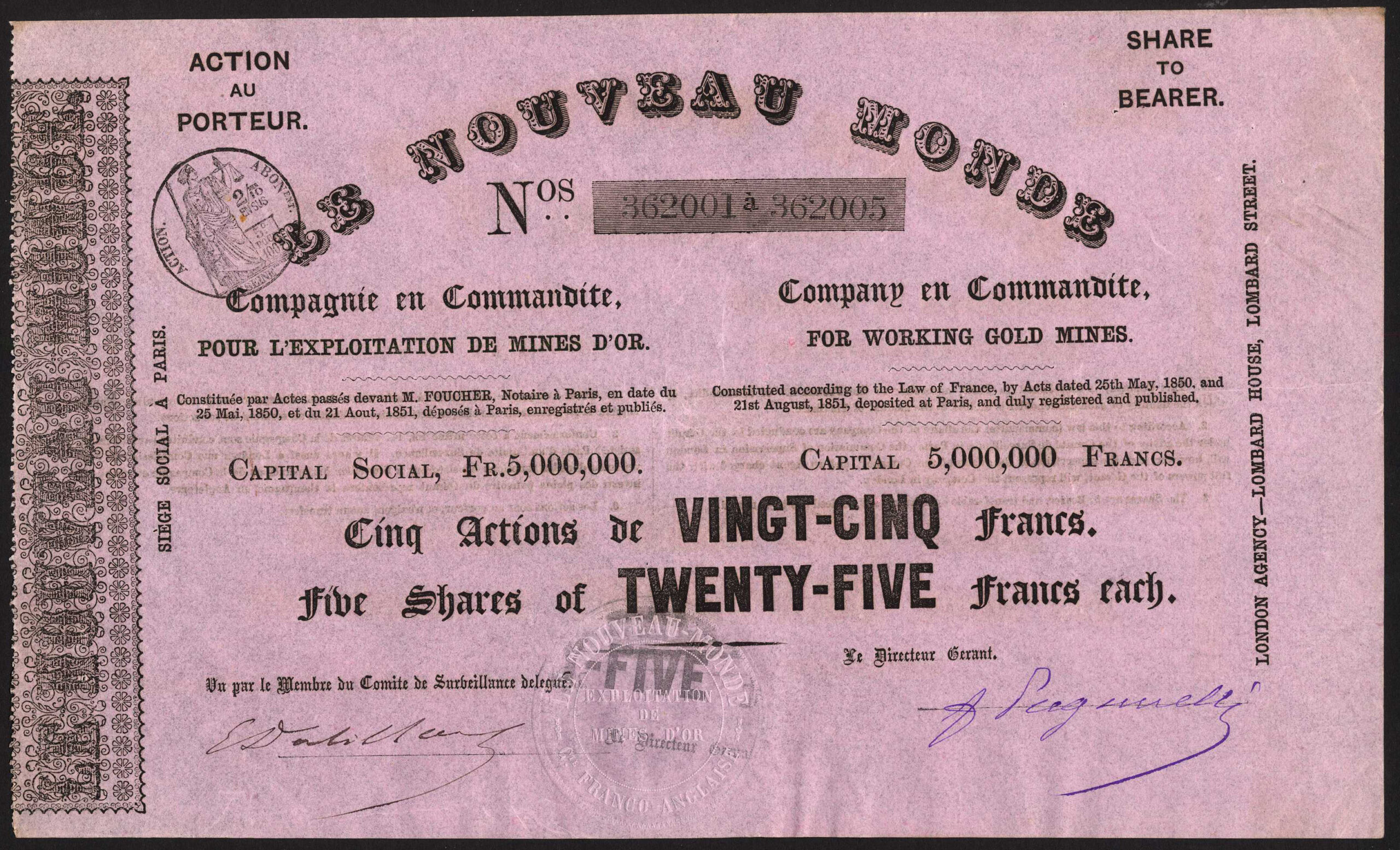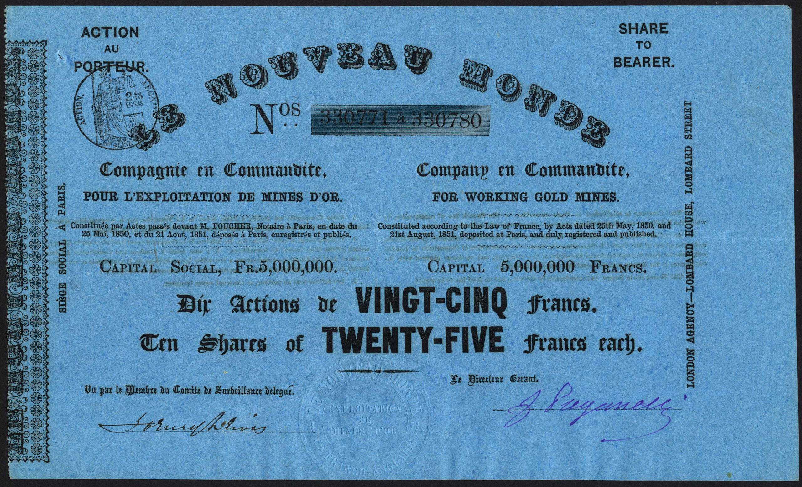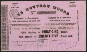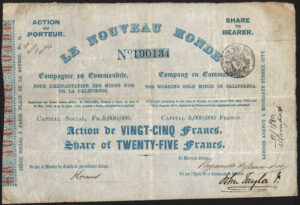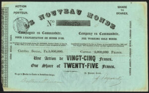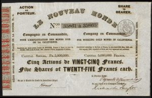 Incorporated in France in 1851 with offices in Paris with an agency in London. To work gold mines in California.