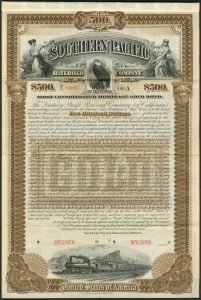 Formed 4th May 1888 by consolidation of the Southern Pacific RR Co., the San Jose and Almaden RR Co., the Pajaro & Santa Cruz RR Co., the Monterey Railroad Co., the Monterey Extension RR Co., the Stockton and Copperopolis RR Co., the San Pablo and Tulare RR Co., the San Pablo and Tulare Extension RR Co., the San Ramon Valley RR Co., the Stockton and Tulare RR Co., the San Joaquin Valley & Yosemite RR Co., the Los Angeles and San Diego RR Co., the Los Angeles and Independence RR Co., the Southern Pacific Branch Railway Co., the Long Beach, Whittier and Los Angeles County RR Co., the Long Beach RR Co., the Southern Pacific Railroad Extension Co., and the Ramona and San Bernardino RR Co.