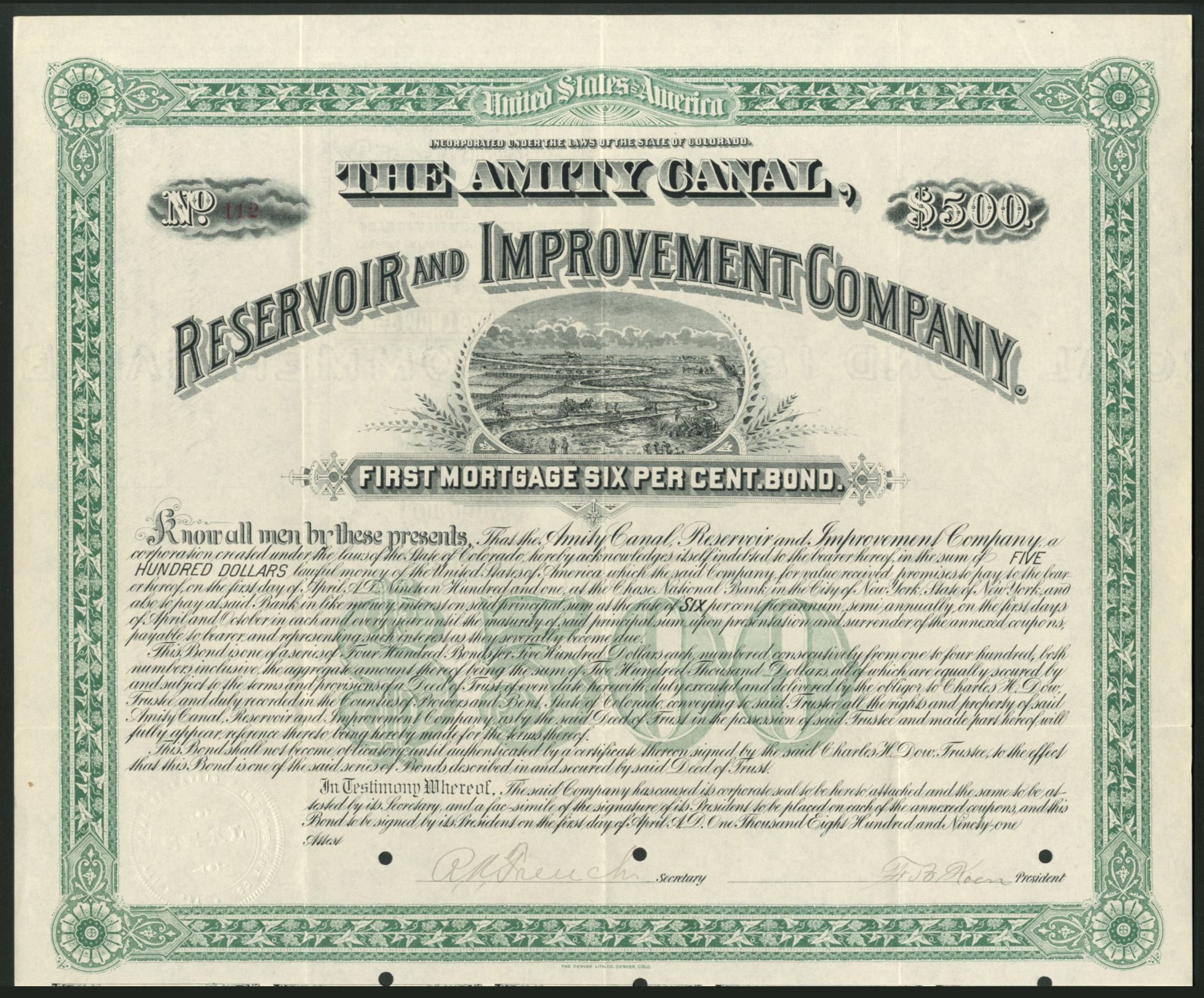 Incorporated in Colorado by 1891 to divert water from the Arkansas River in Colorado for irrigation. Charles Dow was trustee for the bondholders. Charles Henry Dow was an American journalist. He was the co-founder of the Dow Jones Company, as well as the founder of The Wall Street Journal. He was also responsible for inventing the Dow Jones Industrial Average and the Dow Theory.