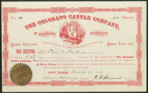 Incorporated in Connecticut by 1879. Purchased the Hermonsville and Huerfano Ranches of 87,000 acres in Southern Colorado. Newspapers report that P.T.Barnum is ‘one of the head men’ of the organisation. A controlling interest in the company was acquired by William H Vanderbilt, Eastman and friends to make the ranch one of the largest in the world.