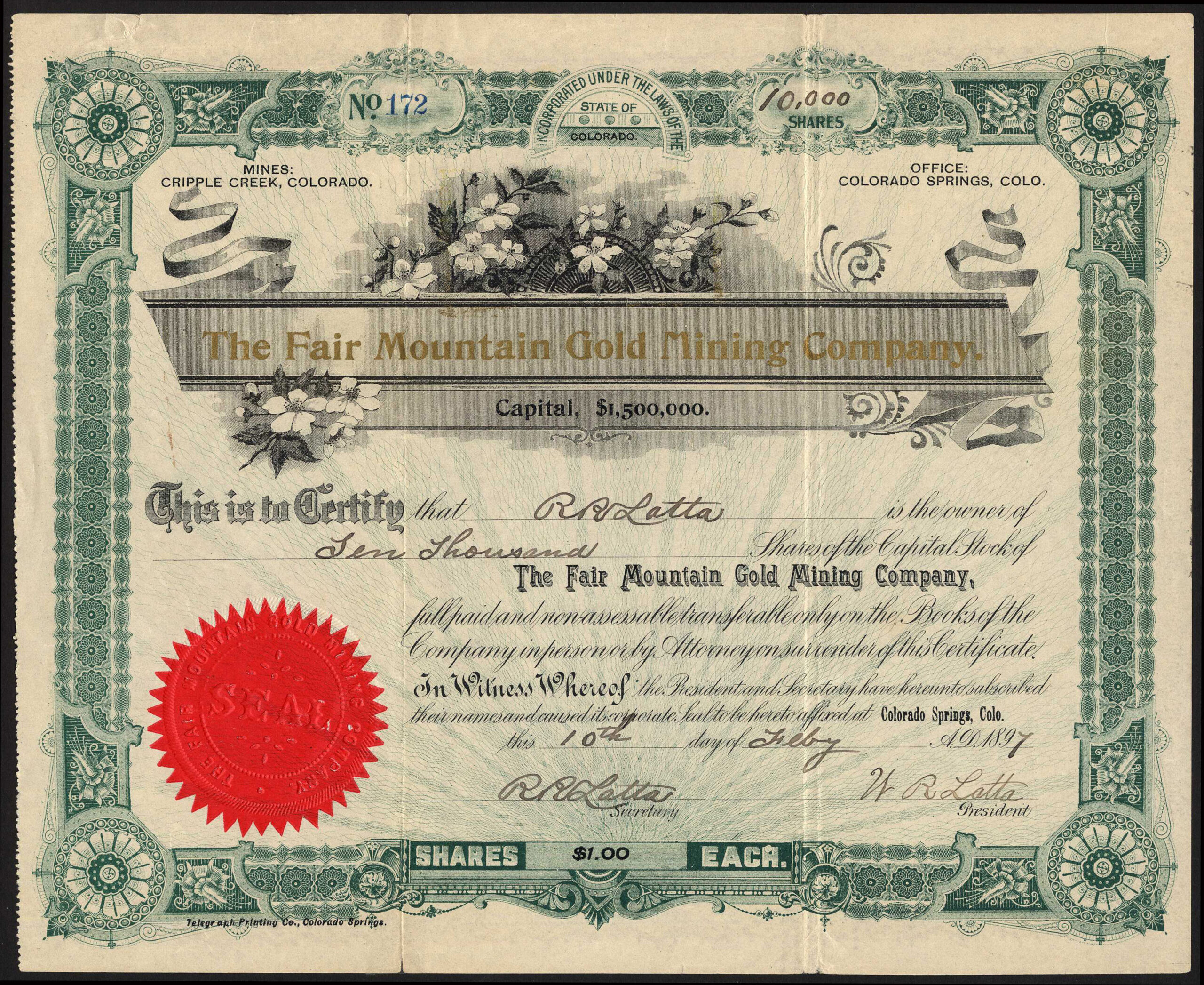 Incorporated in Colorado by 1897. Mines in Cripple Creek.