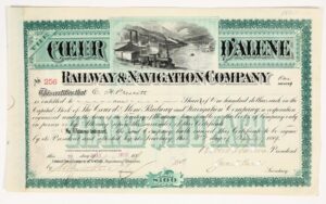 Incorporated in Idaho in 1886, promoted by prominent Spokane businessman Daniel C. Corbin to build a railroad link from the Coeur d’Alene River to nearby mining regions. Leased to the Northern Pacific Railroad in 1888 and sold to that company after foreclosure in 1897.